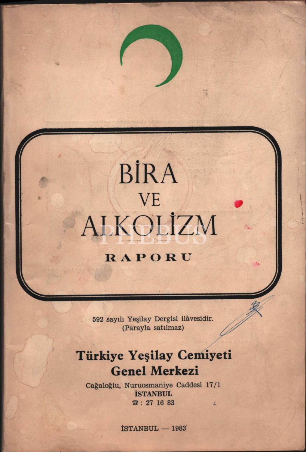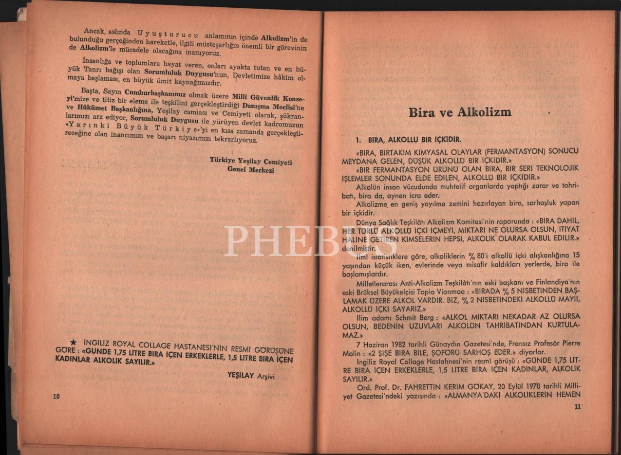 BİRA VE ALKOLİZM RAPORU, Türkiye Yeşilay Cemiyeti Genel Merkezi, İstanbul 1983, 77 sayfa, 16x23 cm