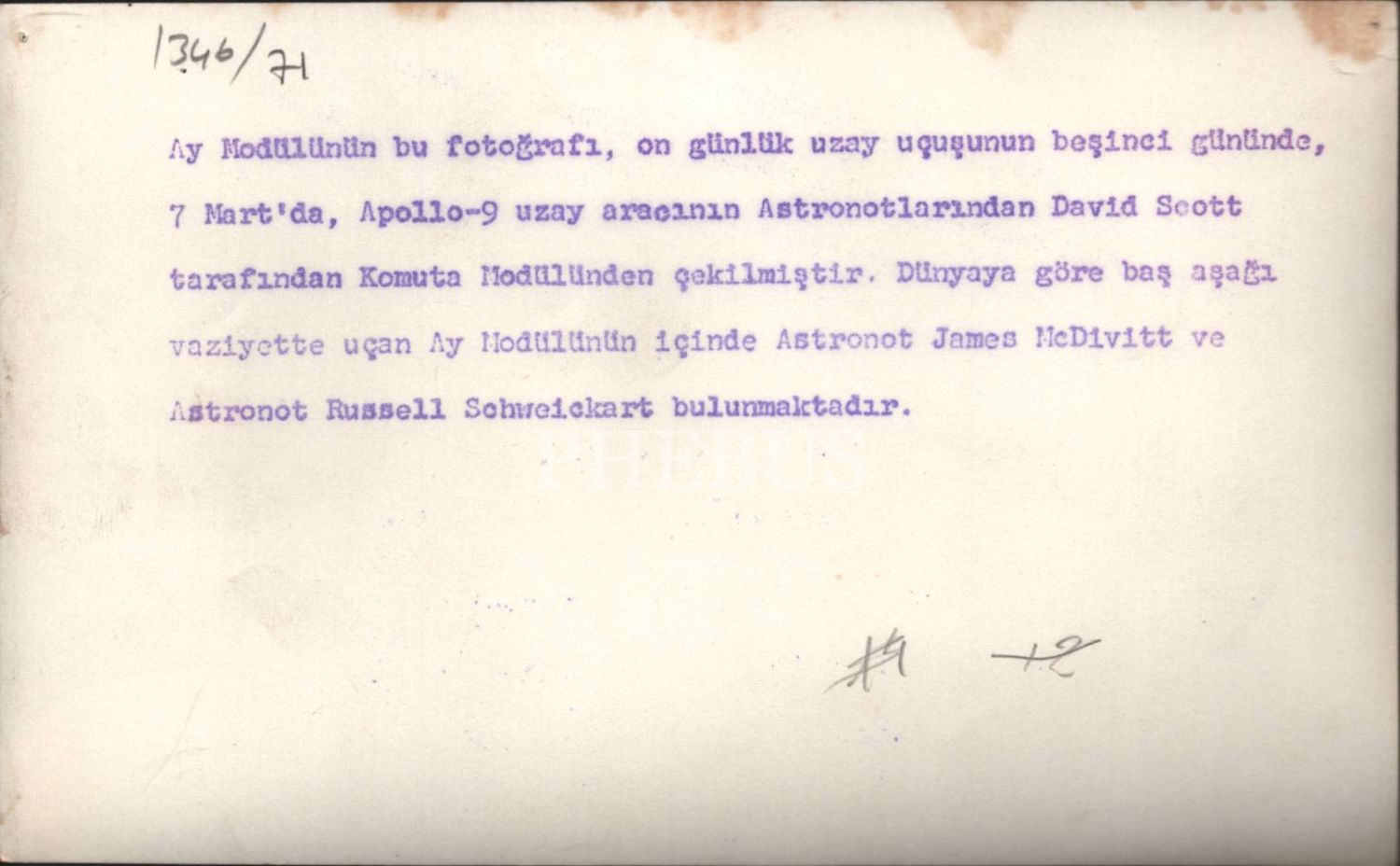 "Ay modülünün bu fotoğrafı, on günlük uzay uçuşunun beşinci gününde, 7 Mart´ta Apollo-9 uzay aracının astronotlarından David Scott tarafından komuta modülünden çekilmiştir."