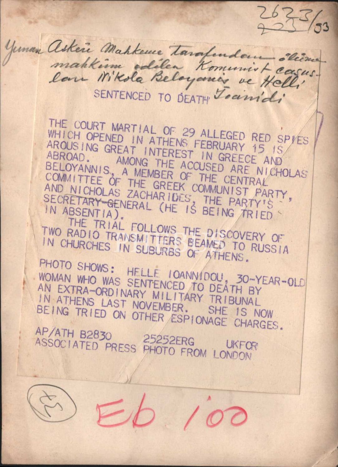 Siyasi tarih: Yunan Askeri Mahkemesi tarafından ölüme mahkum edilen komünist casus, 15x20 cm