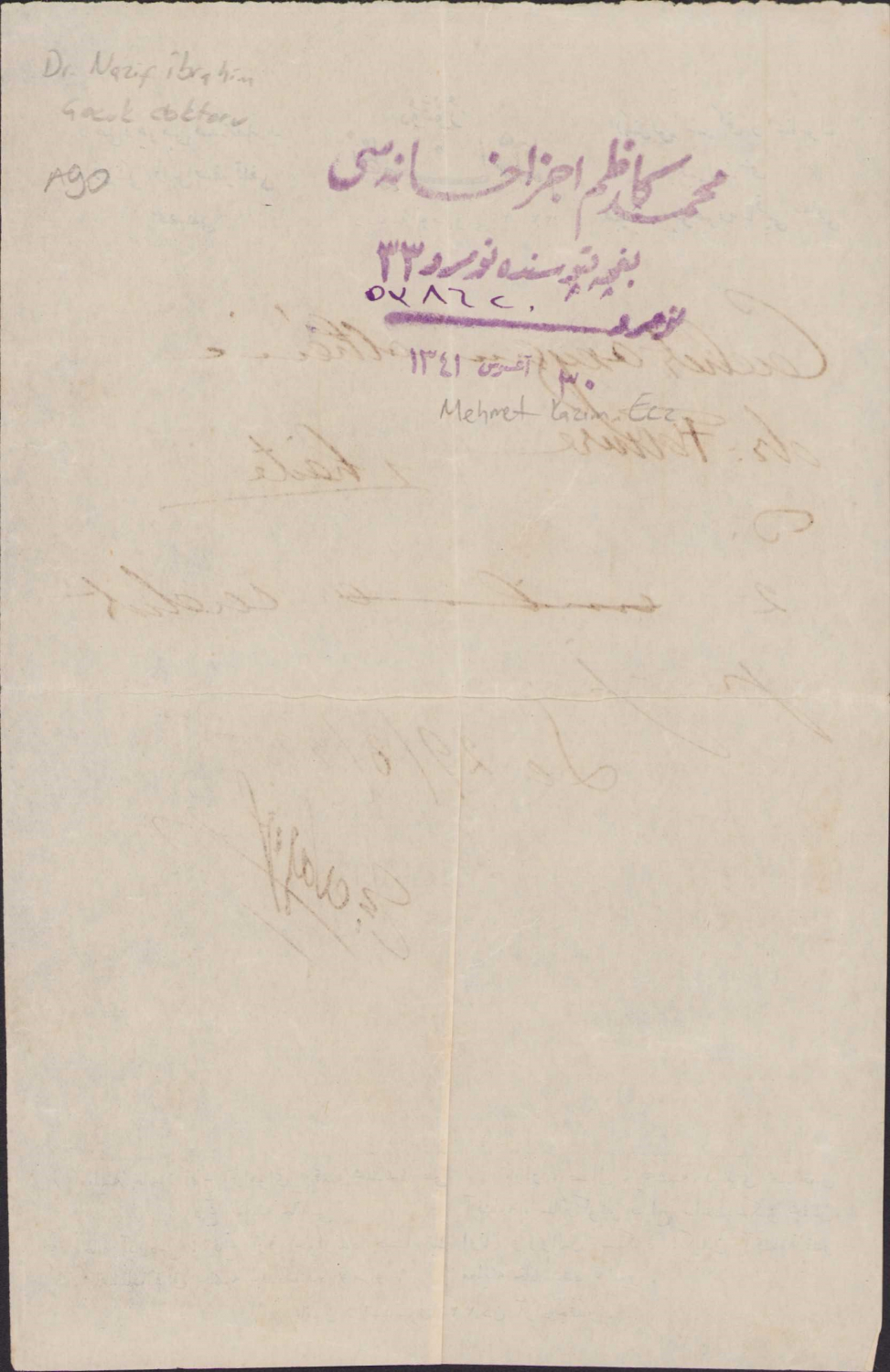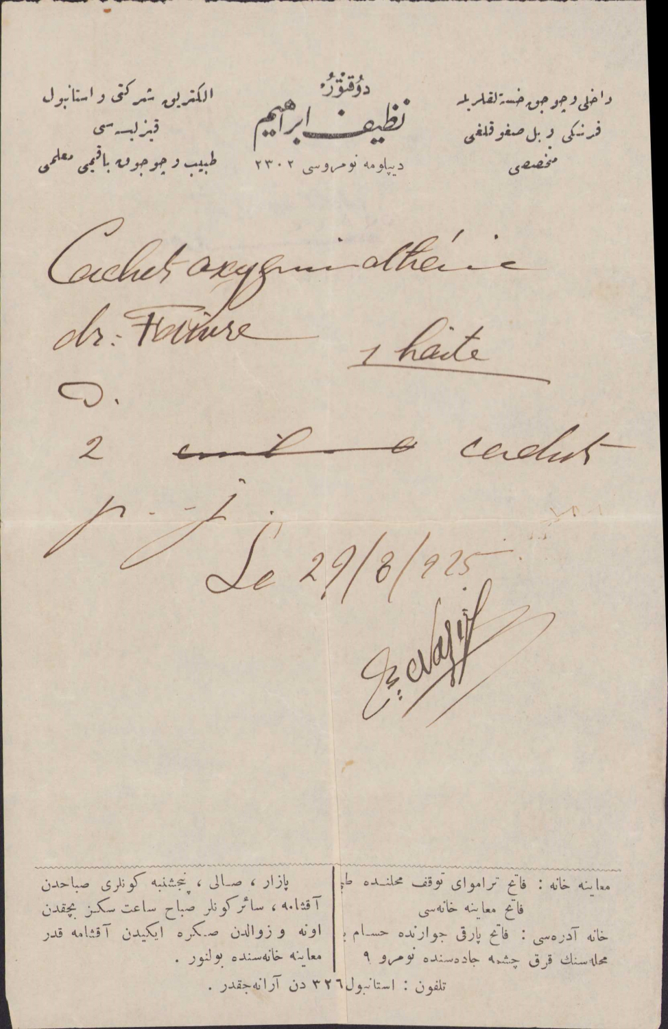 Osmanlıca antetli, Dr. Nazif İbrahim, çocuk doktoru, 1925 tarihli reçete, arkası eczane kaşeli