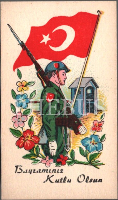 Türk bayrağı ve asker görselli bayram tebrik kartı
