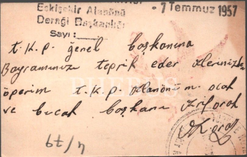 T. K. P. Genel Başkanına gönderilen bayram tebrik kartı