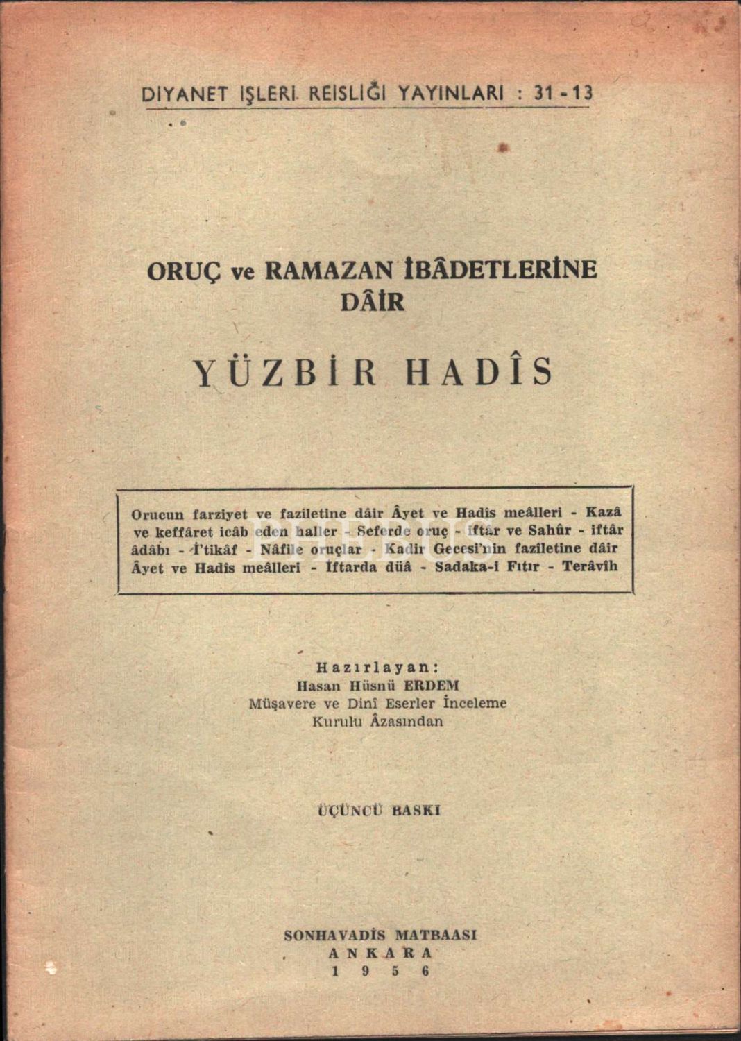 Oruç ve Ramazan İbâdetlerine Dâir YÜZBİR HADÎS, hazl. Hasan Hüsnü Erdem, Son Havadis Matbaası, 1956, 24 sayfa