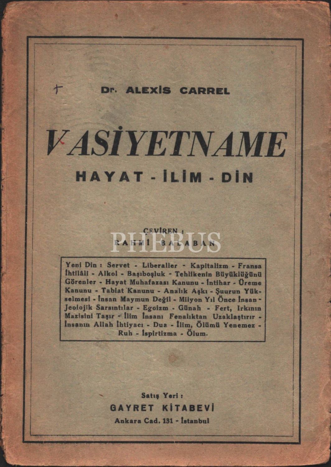 VASİYETNAME (Hayat- İlim- Din), Dr. Alexis Carrel, çev. Rahmi Balaban, Gayret Kitabevi, 40 sayfa