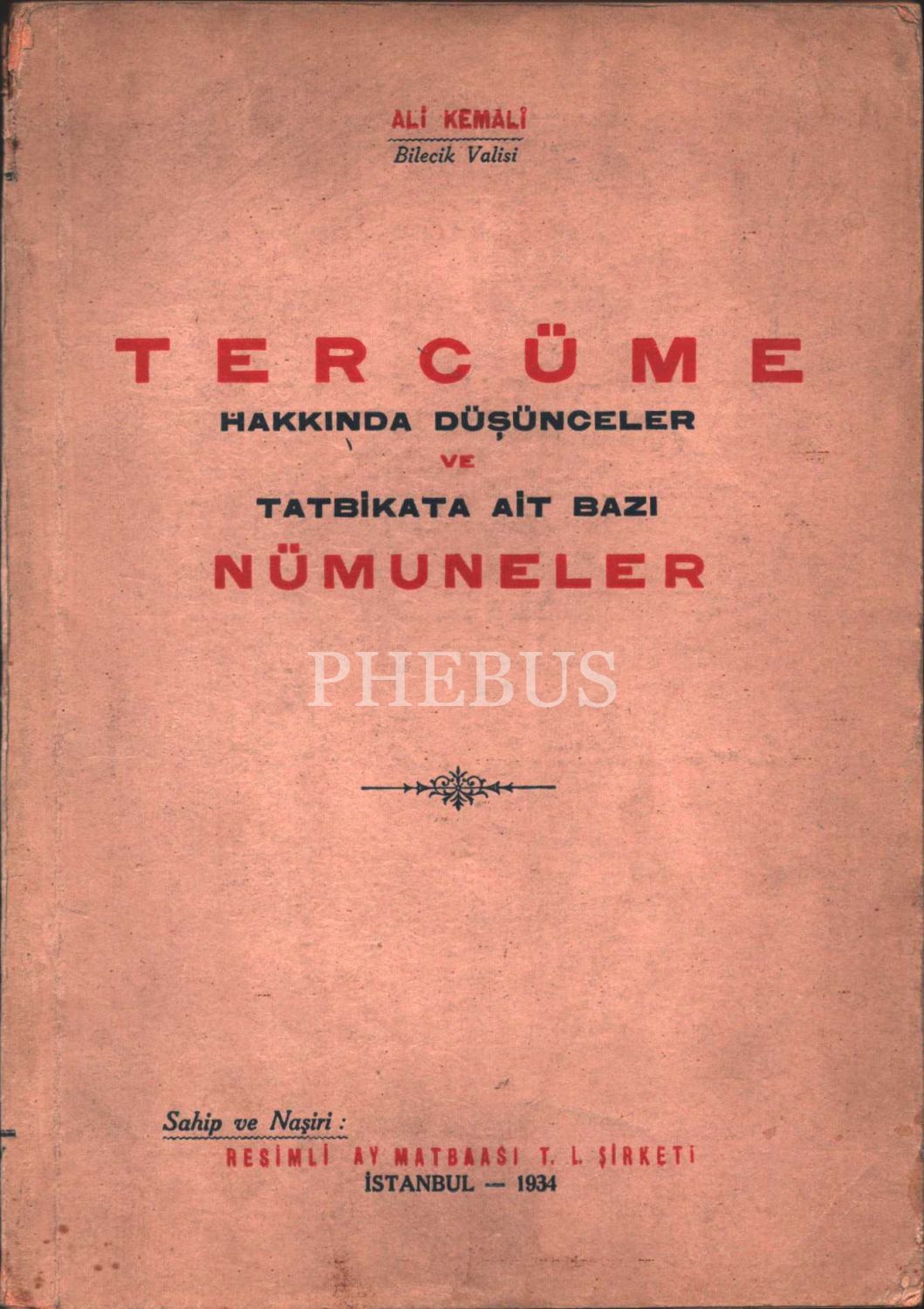 TERCÜME HAKKINDA DÜŞÜNCELER VE TATBİKATA AİT BAZI NÜMUNELER, Ali Kemâli, Resimli Ay Matbaası, 1934, 250 sayfa