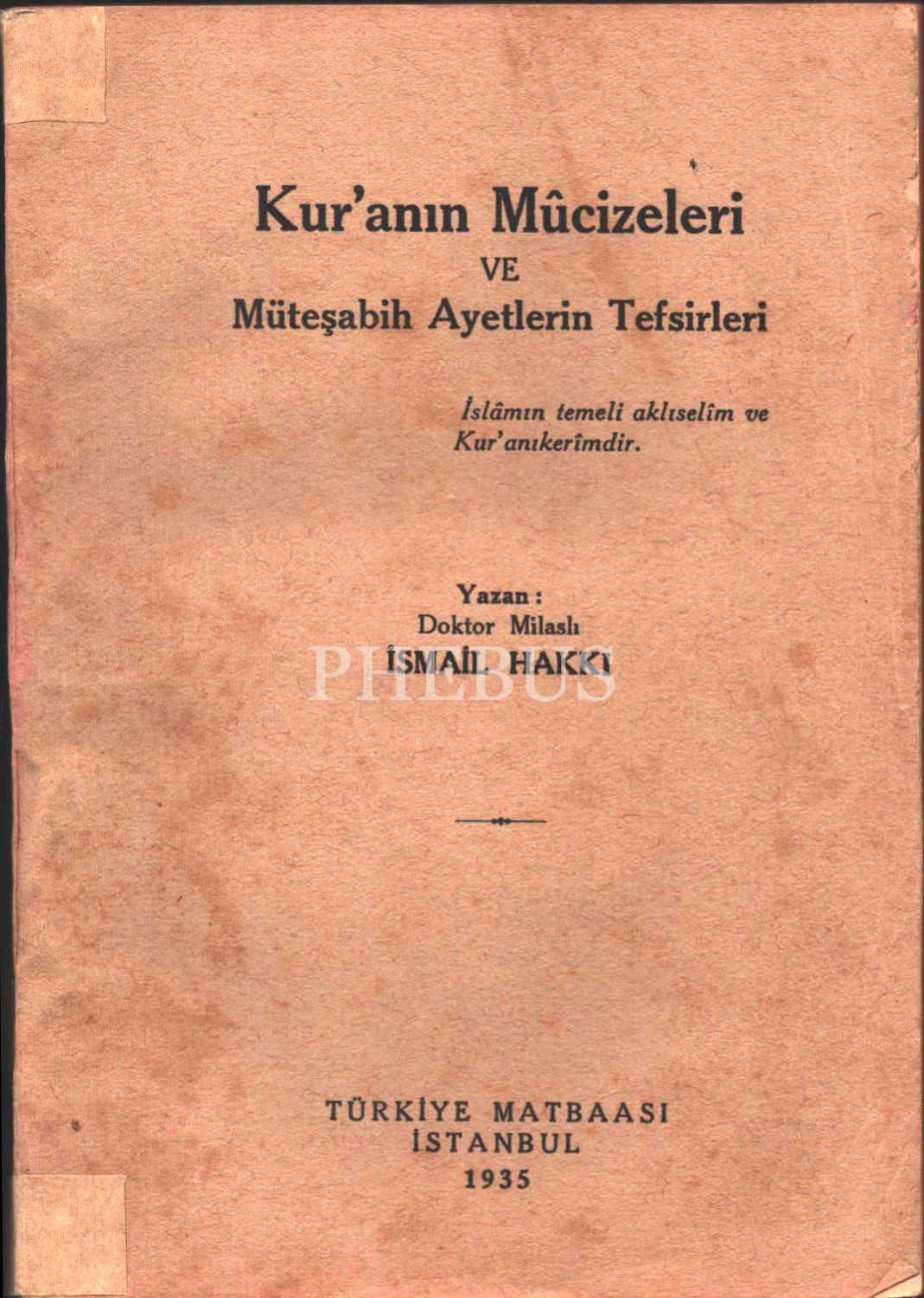 KUR´ANIN MÛCİZELERİ VE MÜTEŞABİH AYETLERİN TEFSİRLERİ, Dr. Milaslı İsmail Hakkı, Türkiye Matbaası, 1935, 165 sayfa