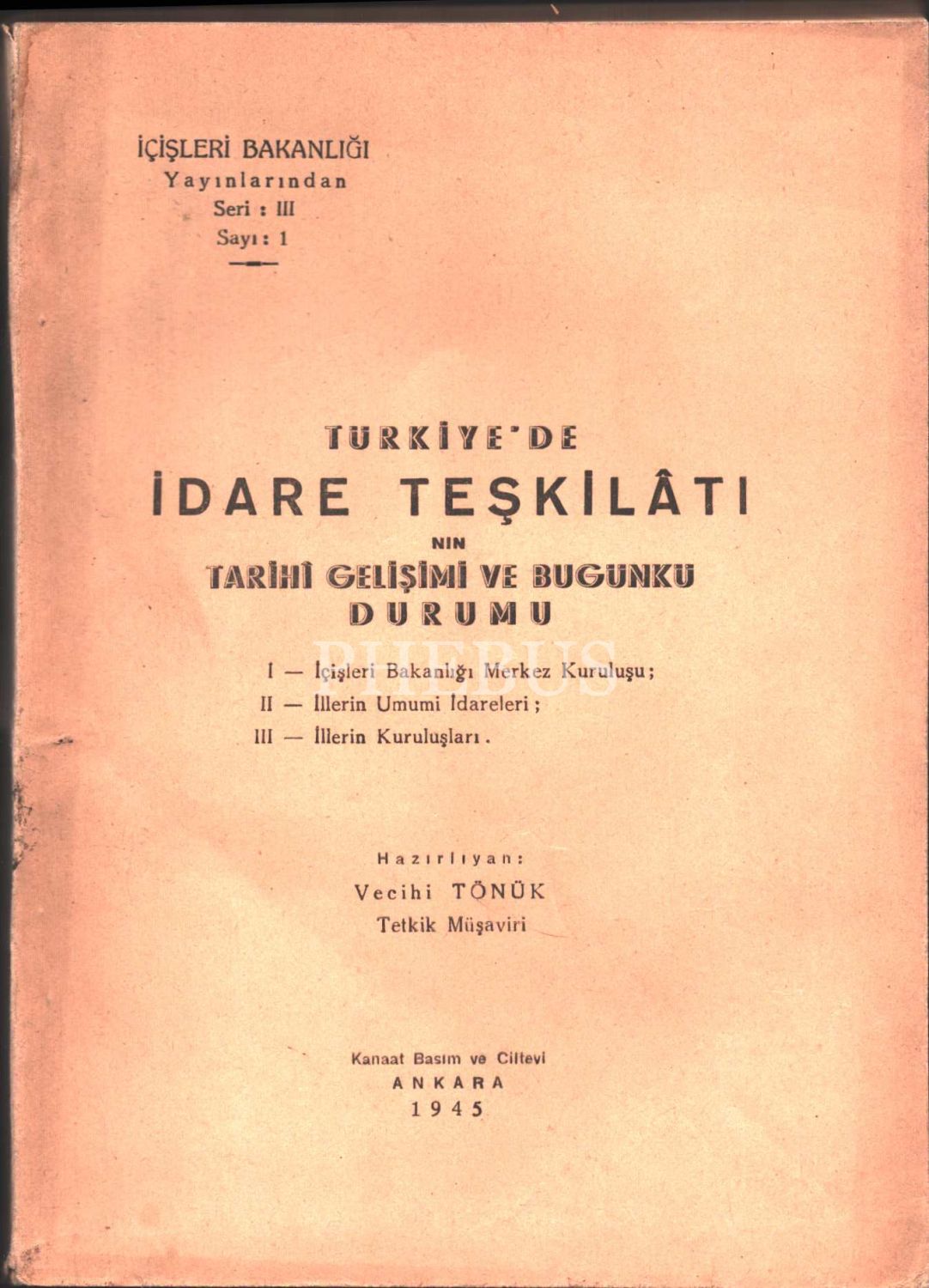 TÜRKİYE´DE İDARE TEŞKİLÂTININ TARİHİ GELİŞİMİ VE BUGÜNKÜ DURUMU, haz. Vecihi Tönük, Kanaat Basımevi, 1945, 36 sayfa