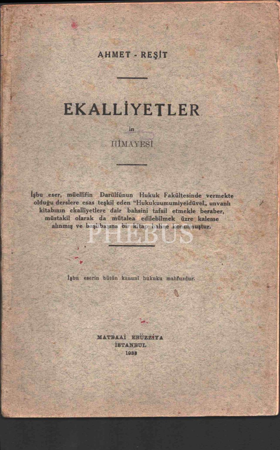 EKALLİYETLERİN HİMAYESİ, Ahmet Reşit, Matbaai Ebüzziya, 1938, 56 sayfa