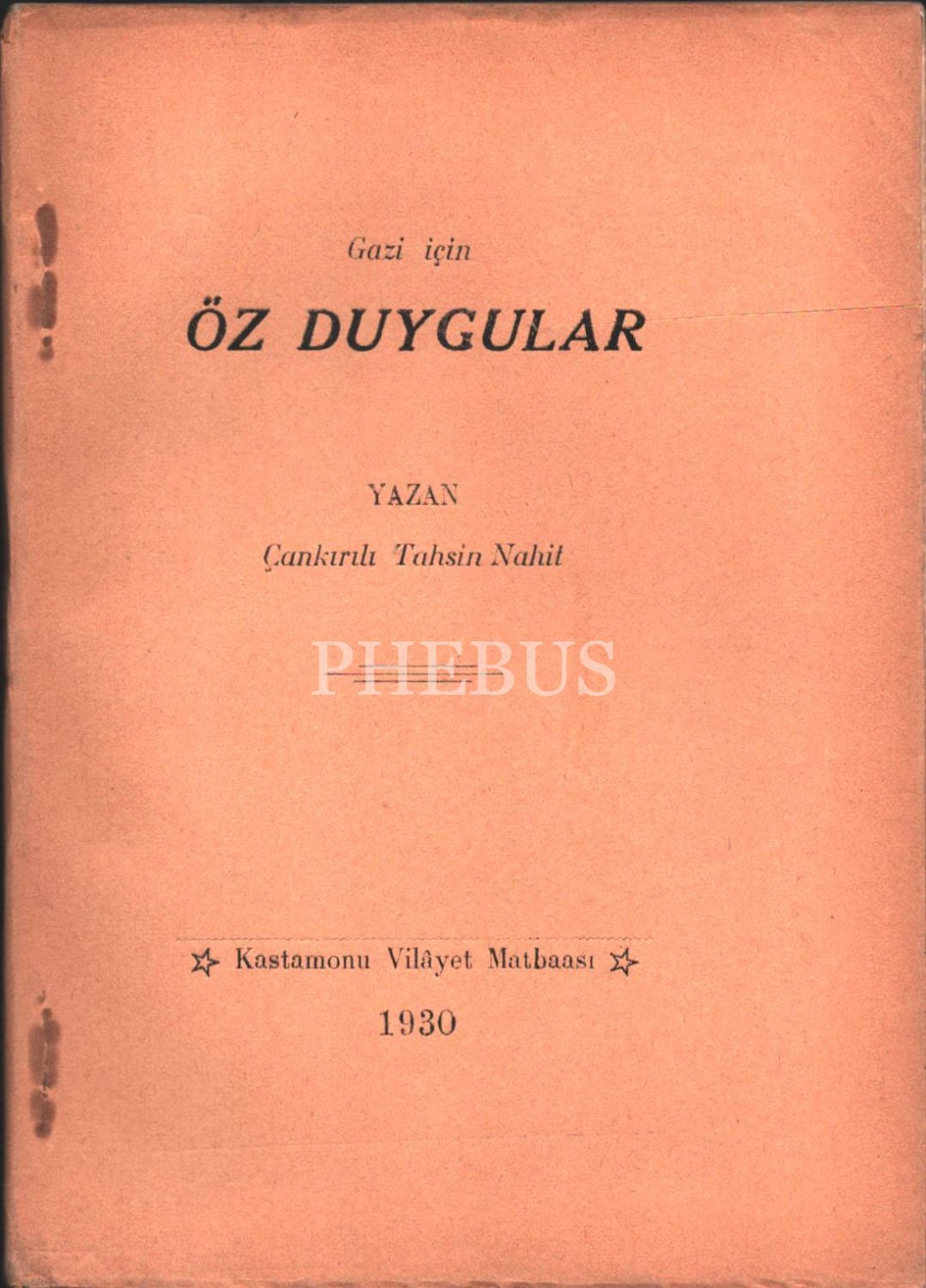 GAZİ İÇİN ÖZ DUYGULAR, Çankırılı Tahsin Nahit, Kastamonu Vilayet Matbaası, 1930, 100 sayfa