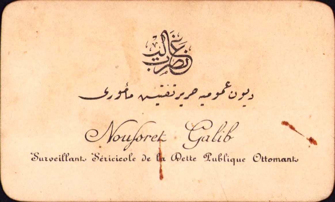 Bursa İpek Böcekçiliği Mektebi müdür muavini, Nusret Galip - Divan-ı Umumiye teftiş memuru, Osmanlıca - Fransızca kartvizit, 9x5 cm