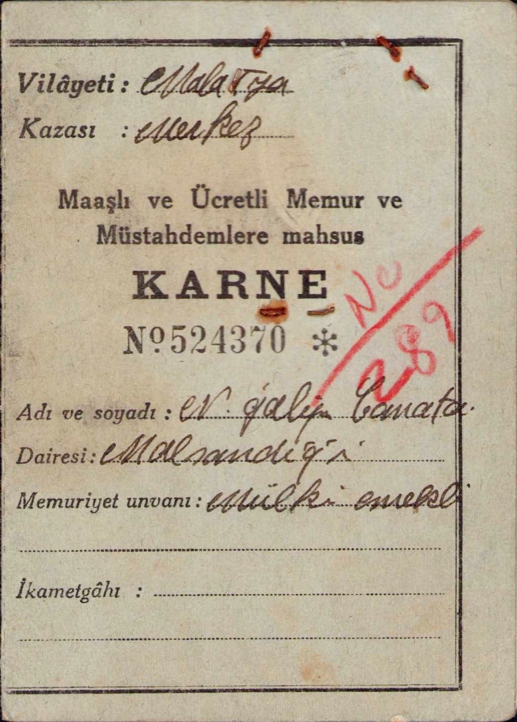 Bursa İpek Böcekçiliği Mektebi müdür muavini, Nusret Galip, Maaşlı ve Ücretli Memur ve Müstahdemlere mahsus Karne, 8x12 cm