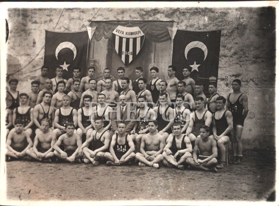 Vefa Kumkapı güreşçilerinin toplu hatıra fotoğrafı, 9x12 cm