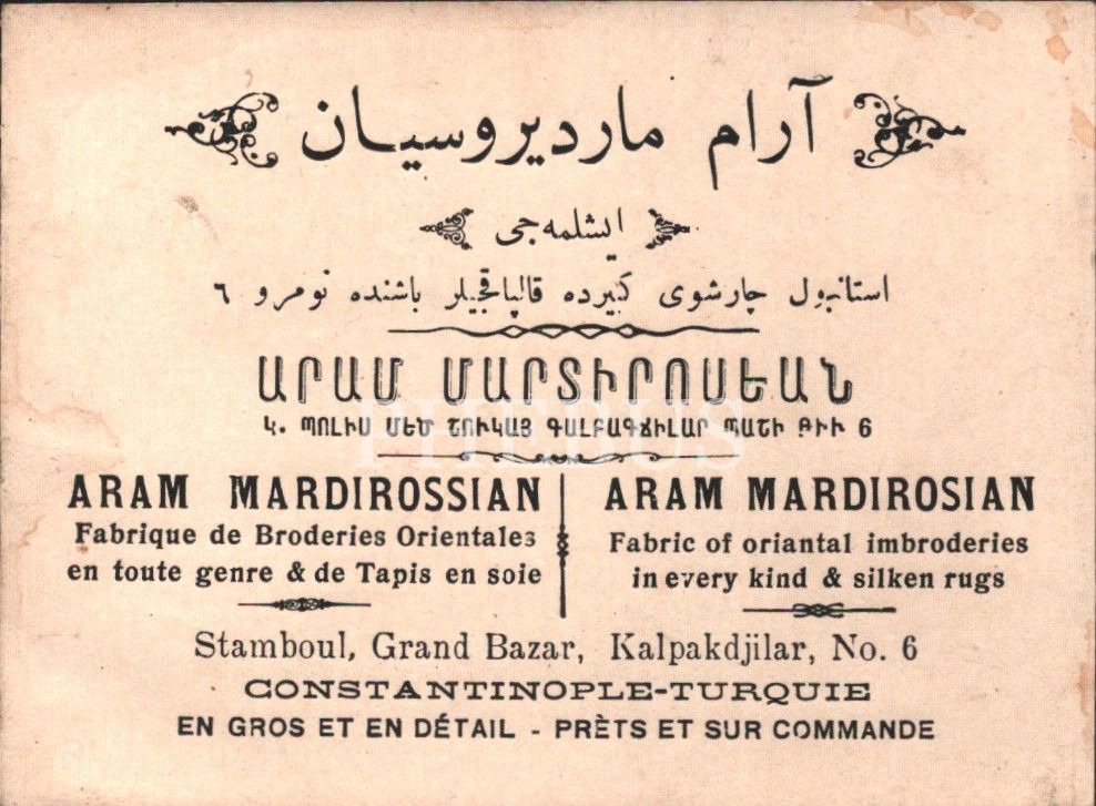 İşlemeci Aram Mardirosiyan mağazasına ait Osmanlıca-Ermenice-Fransızca-İngilizce işyeri kartı, 9x12 cm