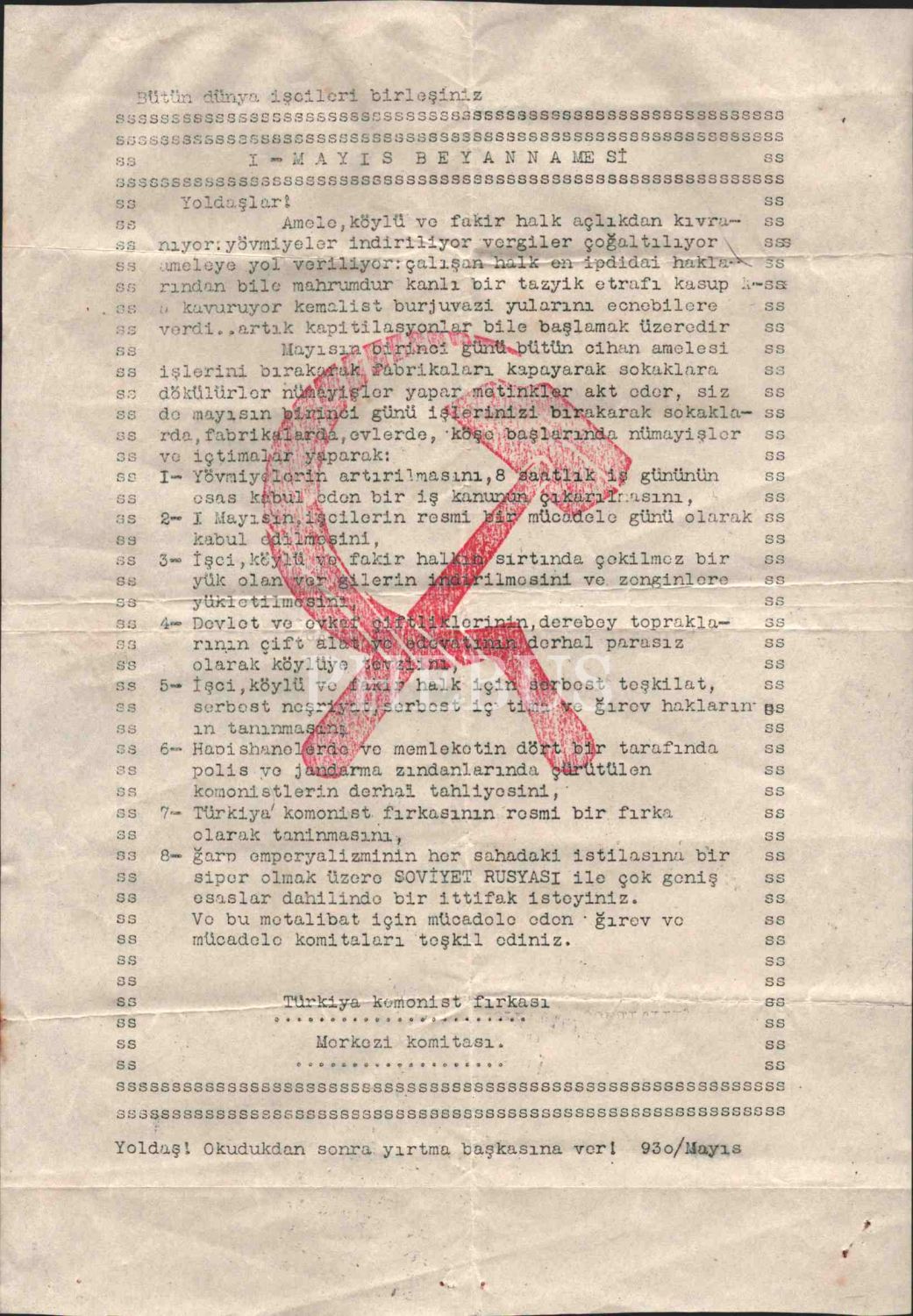 Türkiya Komonist Fırkası tarafından 1930 yılında yayınlanan 1 MAYIS BEYANNAMESİ: "Bütün dünya işçileri birleşiniz", 21x30 cm