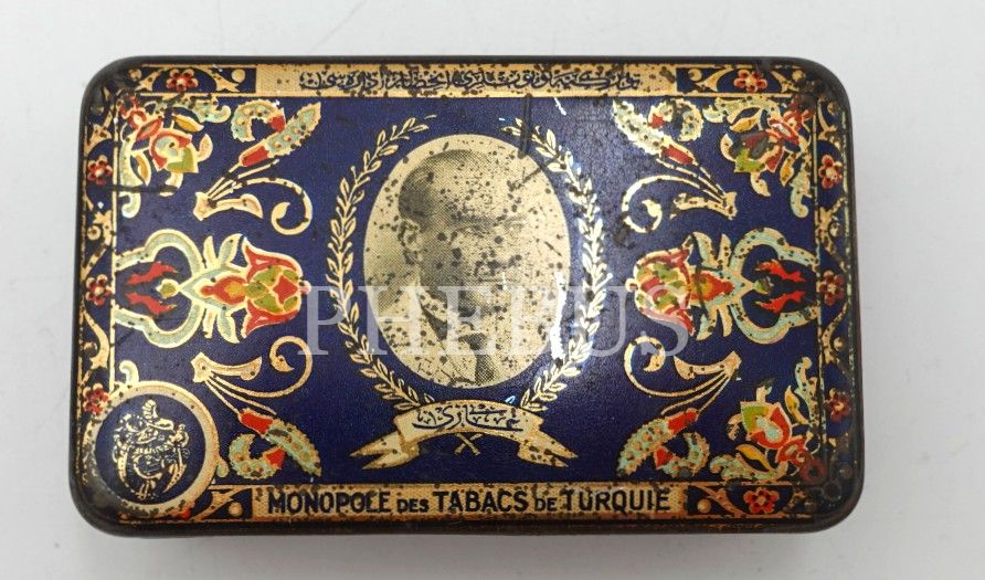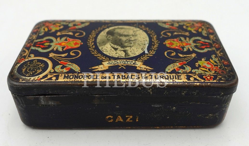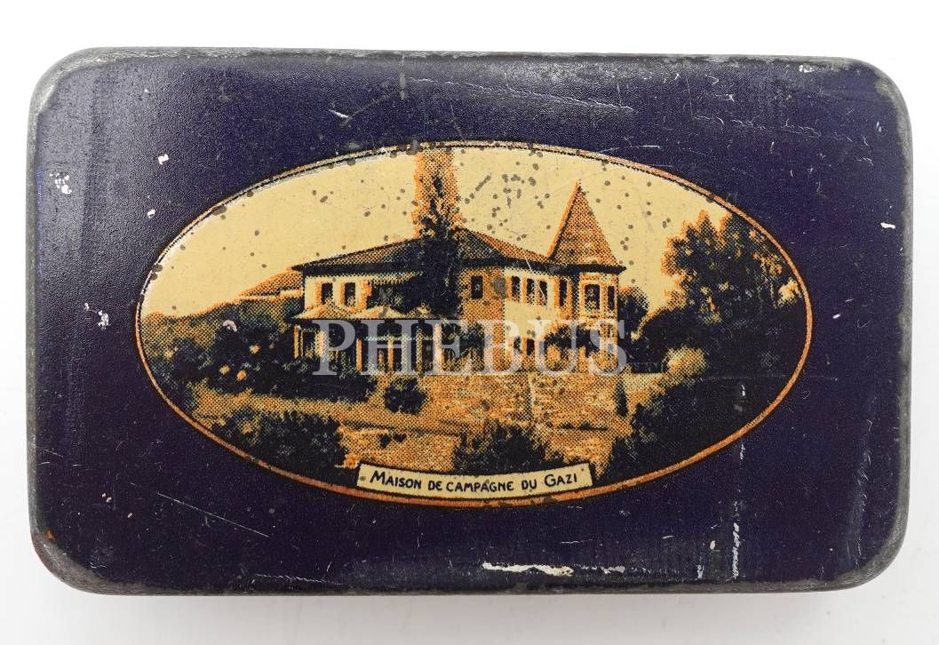 Atatürk ve Gazi Köşkü görselli, Türkiye Tütünleri İnhisar İdaresi teneke sigara kutusu, 2x4x7 cm
