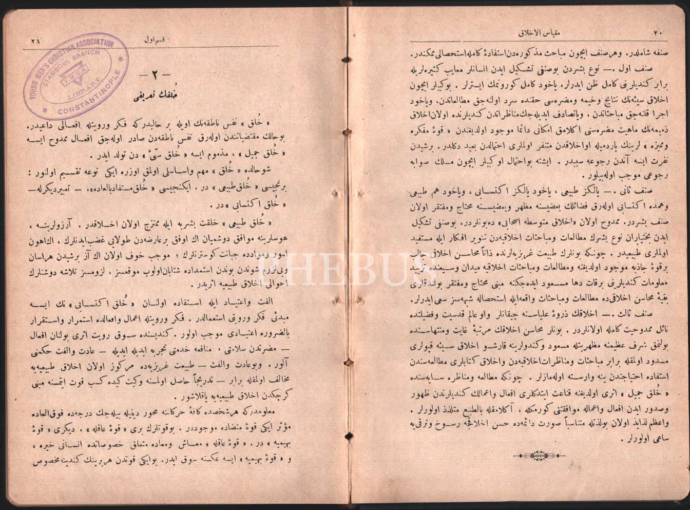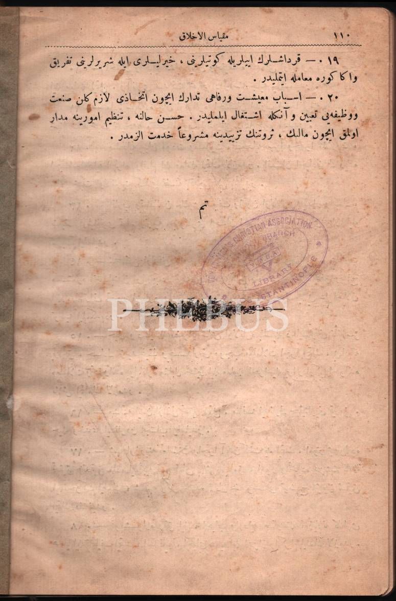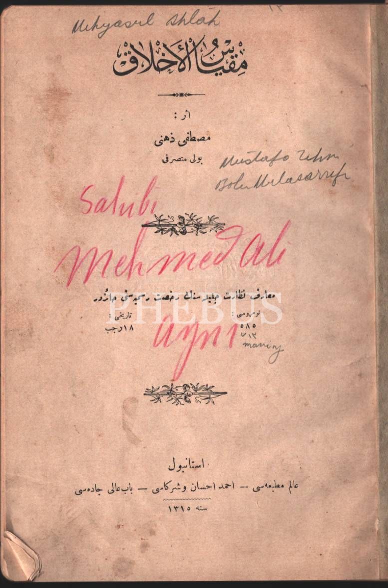 Son devir düşünür ve idarecilerinden Mehmed Ali Ayni´nin kütüphanesinden MİKYÂSÜ´L-AHLÂK kitabı, yaz. Mustafa Zihni, Young Men´s Chiristian Association- Constantinople damgalı, Alim Matbaası, İstanbul 1315, 110 s., 15x22 cm