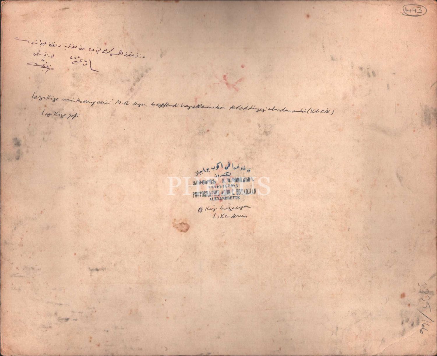 Son devir düşünür ve idarecilerinden Lazkiye Mutasarrıfı Mehmed Ali Ayni´ye ithaflı hatıra fotoğrafı, 1325 tarihli, Osmanlıca-Ermenice- Fransızca "Fotoğrafi Agob Boyacıyan- İskenderun" kaşeli, paspartu: 27x33 cm