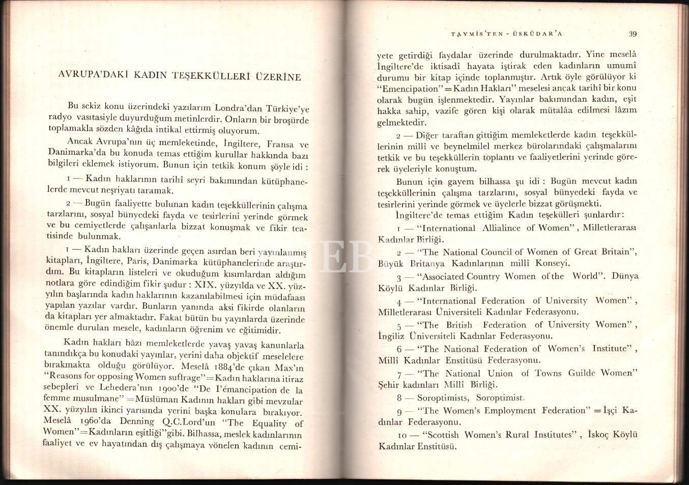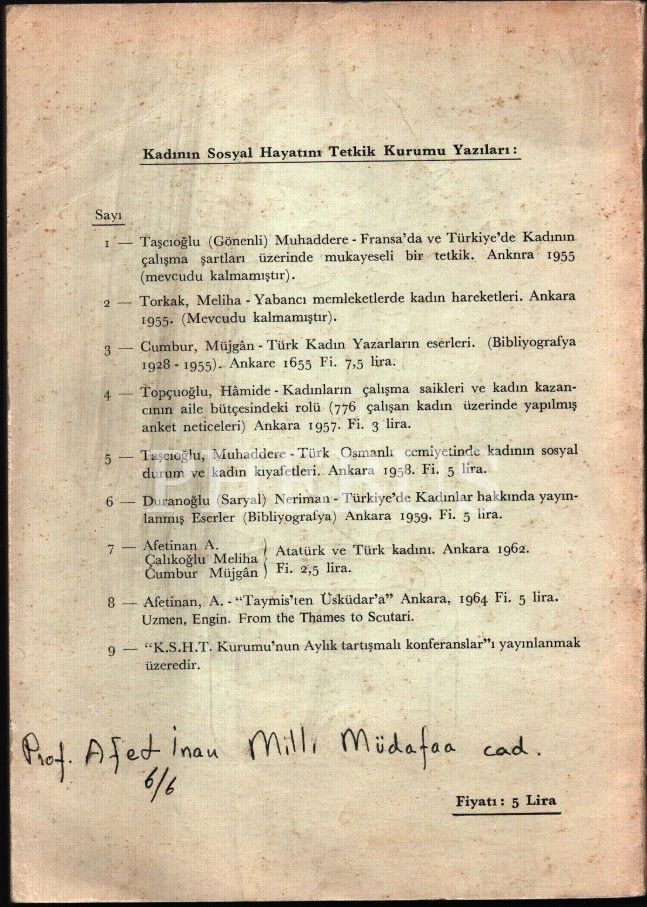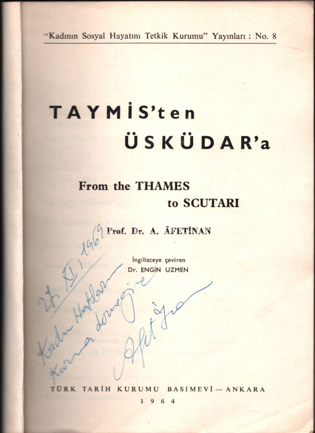 Âfet İnan´dan Kadın Haklarını Koruma Derneği´ne ithaflı ve imzalı Türkçe-İngilizce TAYMİS´TEN ÜSKÜDAR´A, Türk Tarih Kurumu Basımevi, Ankara 1964, 88 s., 14x19 cm