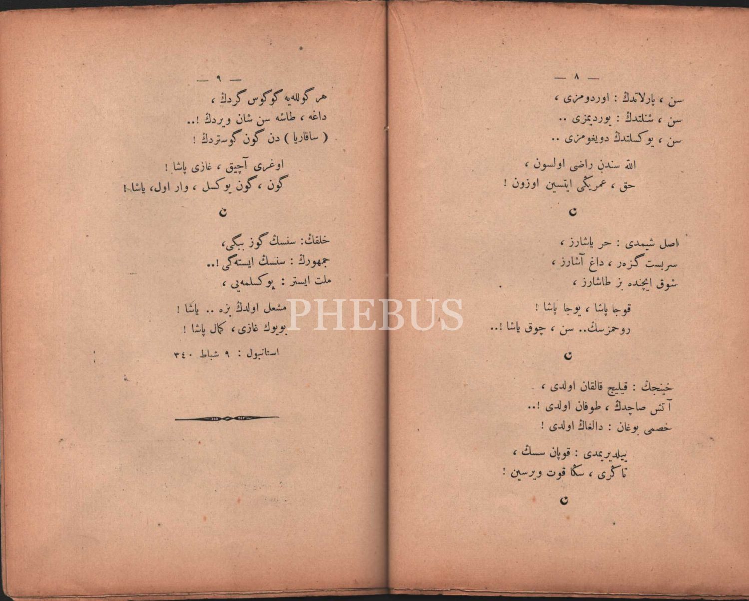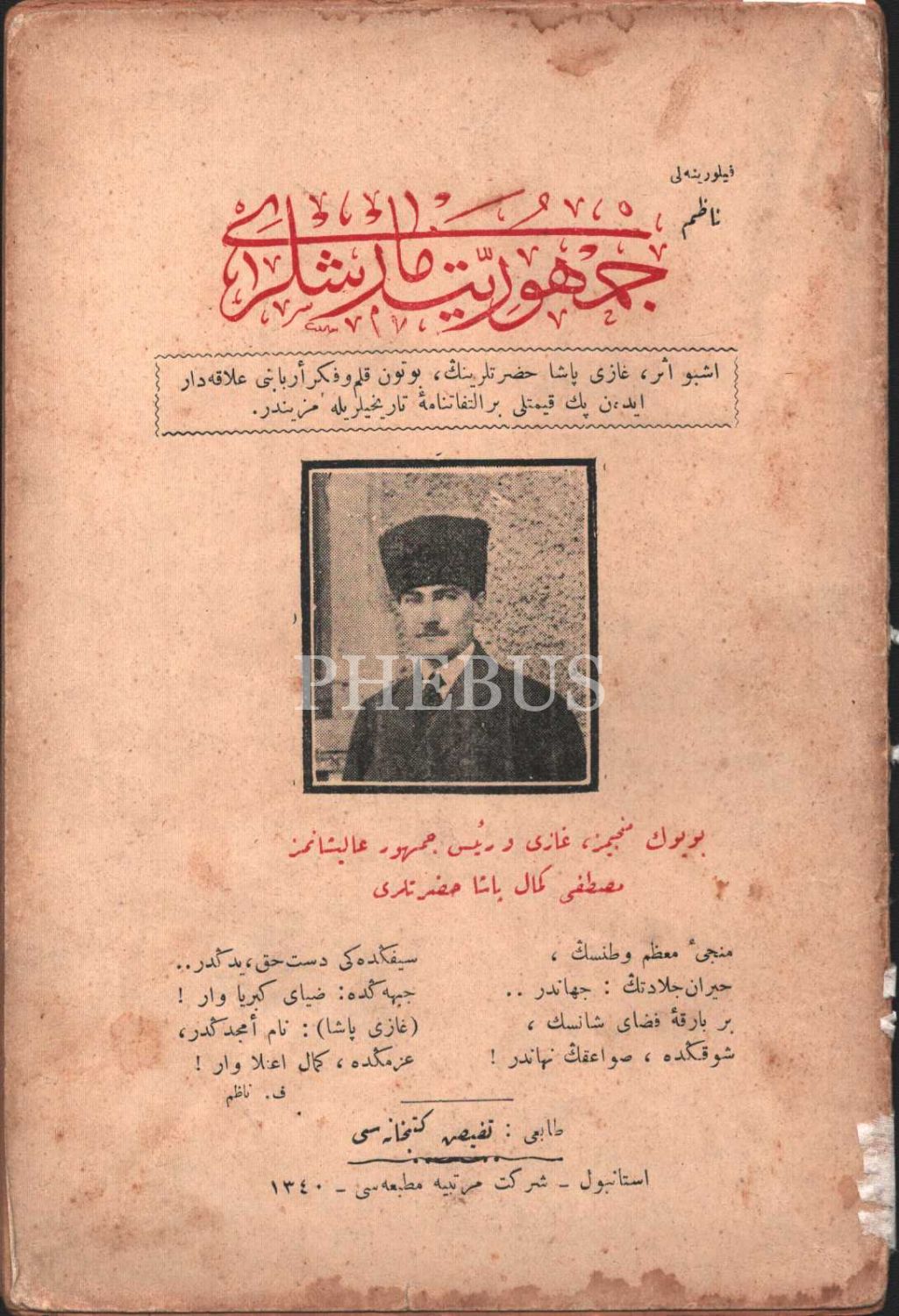 "Münci-i Muazzam-ı Vatan" Mustafa Kemal Atatürk kapaklı CUMHURİYET MARŞLARI, Florinalı Nazım, Şirket-i Mürettibiye Matbaası, İstanbul 1340, 16 s., 14x20 cm