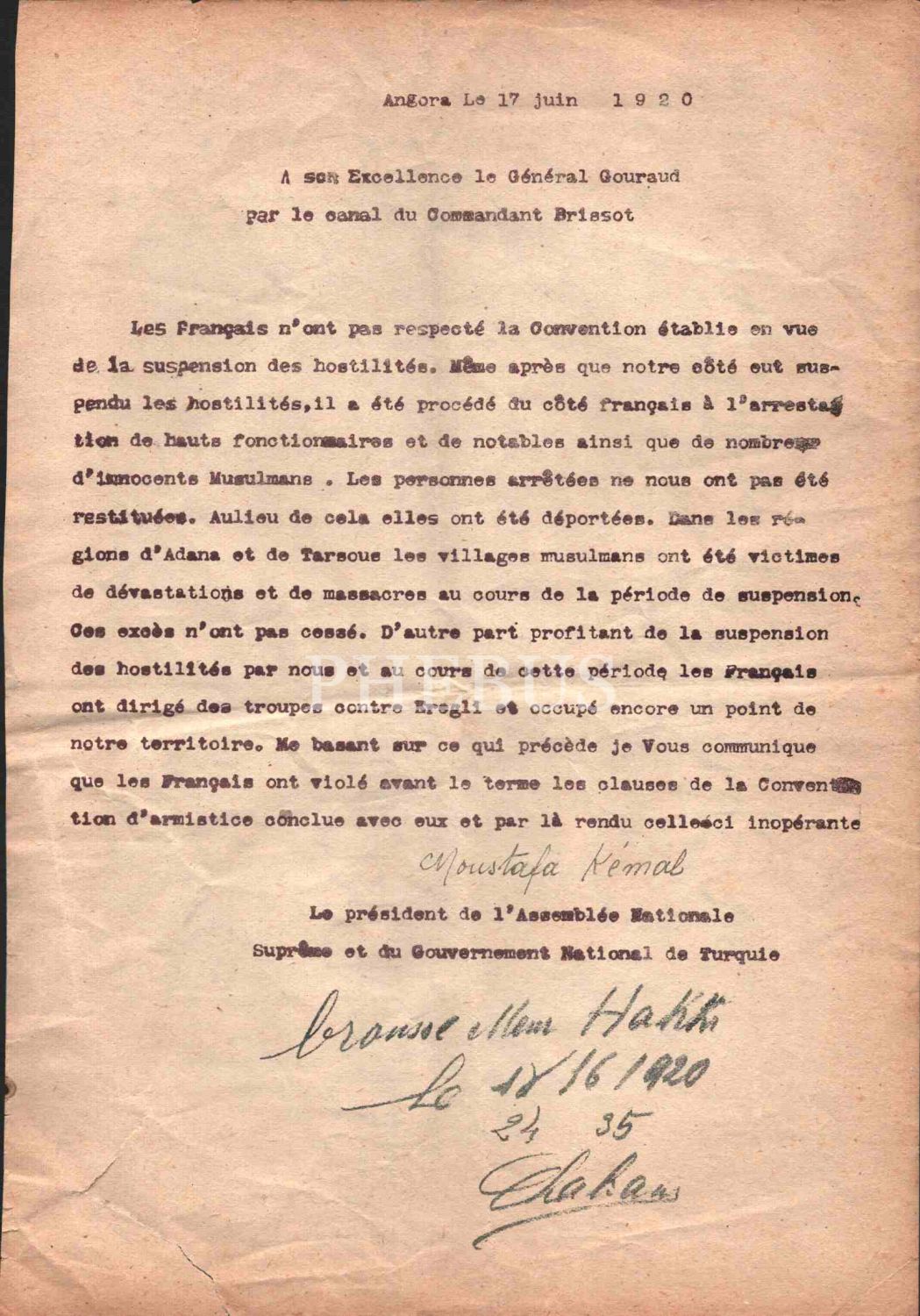 Mustafa Kemal Atatürk´ün, Kumandan Brissot aracılığıyla Fransız General Henri Gouraud´a gönderdiği baskı imzalı Fransızca mektup, Ankara 1920, 20x29 cm