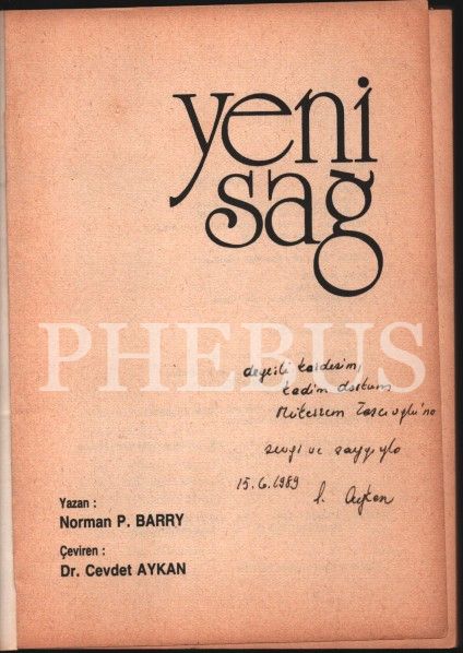 Çeviren Dr. Cevdet Aykan´dan Mükerrem Taşçıoğlu´ya ithaflı ve imzalı YENİ SAĞ, Norman P. Barry, Tisamat, Ankara - 1989, 230 sayfa, 14x20 cm