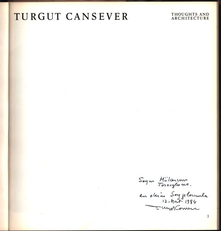 İthaf, "Sayın Mükerrem Taşçıoğlu´na en derin saygılarımla. 13 Mart 1984 Turgut Cansever" şeklindedir.