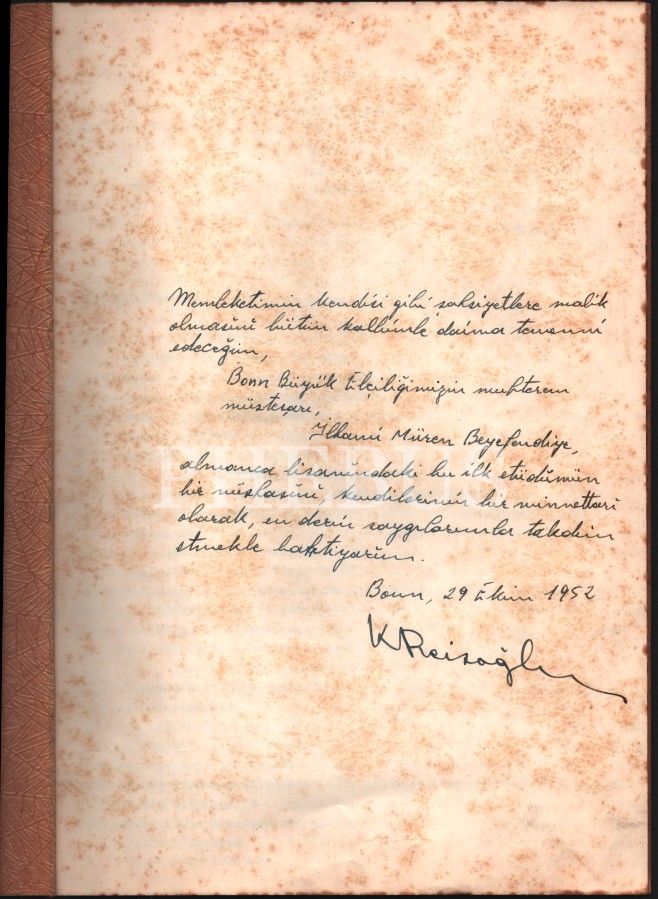 İthaf, "Memleketimin kendisi gibi şahsiyetlere malik olmasını bütün kalbimle daima temenni edeceğim, Bonn Büyük Elçiliğimizin muhterem müşteşarı, İlhami Müren Beyefendiye, Almanca lisanındaki bu ilk etüdümün bir [?], kendilerinin bir minnettarı olarak, en derin saygılarımla takdim etmekle bahtiyarım. Bonn, 29 Ekim 1952 K. Reisoğlu" şeklindedir.