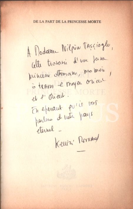 Kenize Mourad´dan Mükerrem Taşçıoğlu´nun eşi Nilgün Taşçıoğlu´ya ithaflı ve imzalı DE LA PART DE LA PRINCESSE MORTE, Editions Robert Laffont, Paris - 1987, 600 sayfa, 16x24 cm