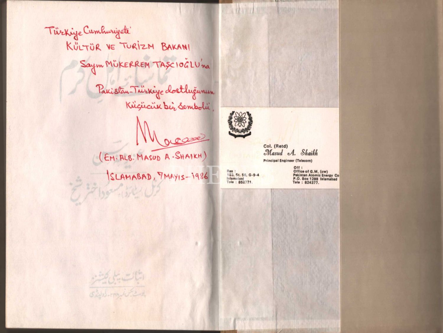 İthaf, "Türkiye Cumhuriyeti KÜLTÜR VE TURİZM BAKANI Sayın MÜKERREM TAŞÇIOĞLU´na Pakistan-Türkiye dostluğunun küçücük bir sembolü. EM. ALB. MASUD A. SHAIKH - ISLAMABAD, 7 MAYIS 1986" şeklindedir.
