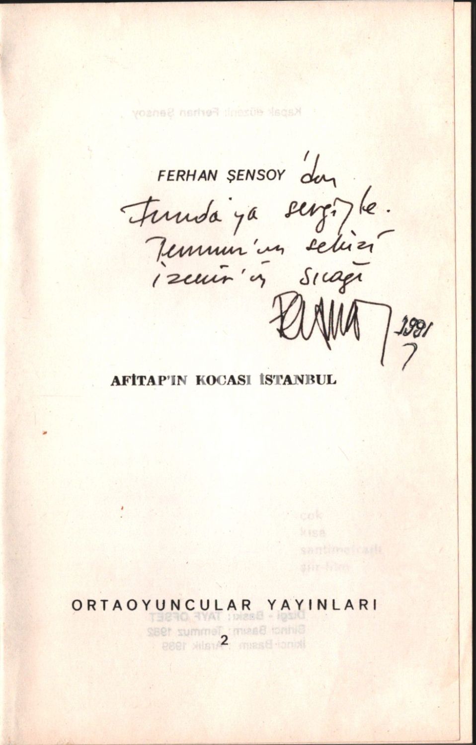 İthaf, "Ferhan Şensoy´dan Funda´ya sevgiyle. Temmuz´un sekizi İzmir´in sıcağı. 1991" şeklindedir.