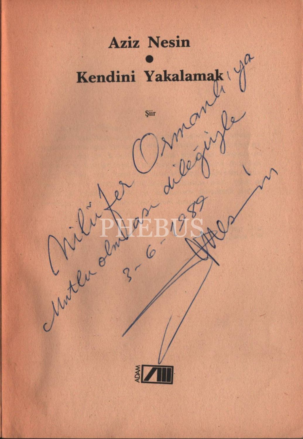 Aziz Nesin´den ithaflı ve imzalı KENDİNİ YAKALAMAK, Adam Yayınları, Mart 1988, 87 sayfa, 14x20 cm, metin kısmı ciltten ayrık haliyle