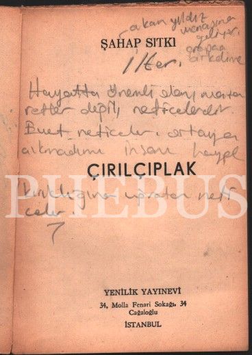 Şahap Sıtkı´dan Samet Ağaoğlu´na ithaflı ve imzalı ÇIRILÇIPLAK, Yenilik Yayınevi, İstanbul - 1957, 73 sayfa, 12x17 cm