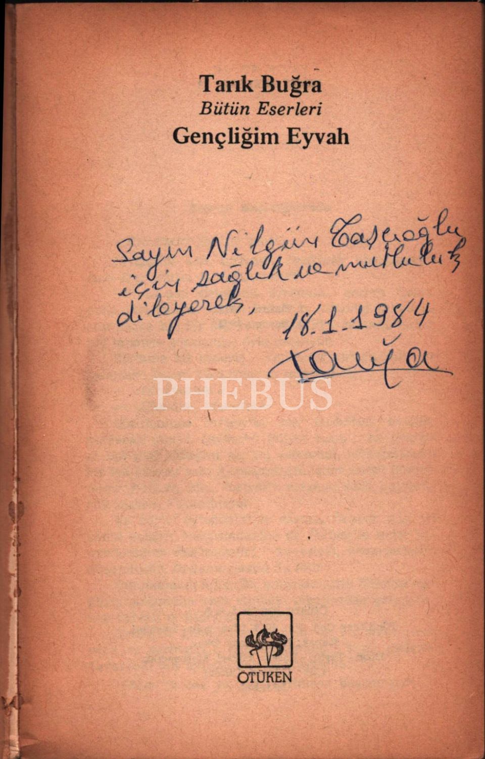 Tarık Buğra´dan Kültür ve Turizm Bakanı Mükerrem Taşçıoğlu´nun eşi Nilgün Taşçıoğlu´ya ithaflı, imzalı ve mektuplu GENÇLİĞİM EYVAH, Ötüken Yayınları, 1982, 391 sayfa, 12x20 cm