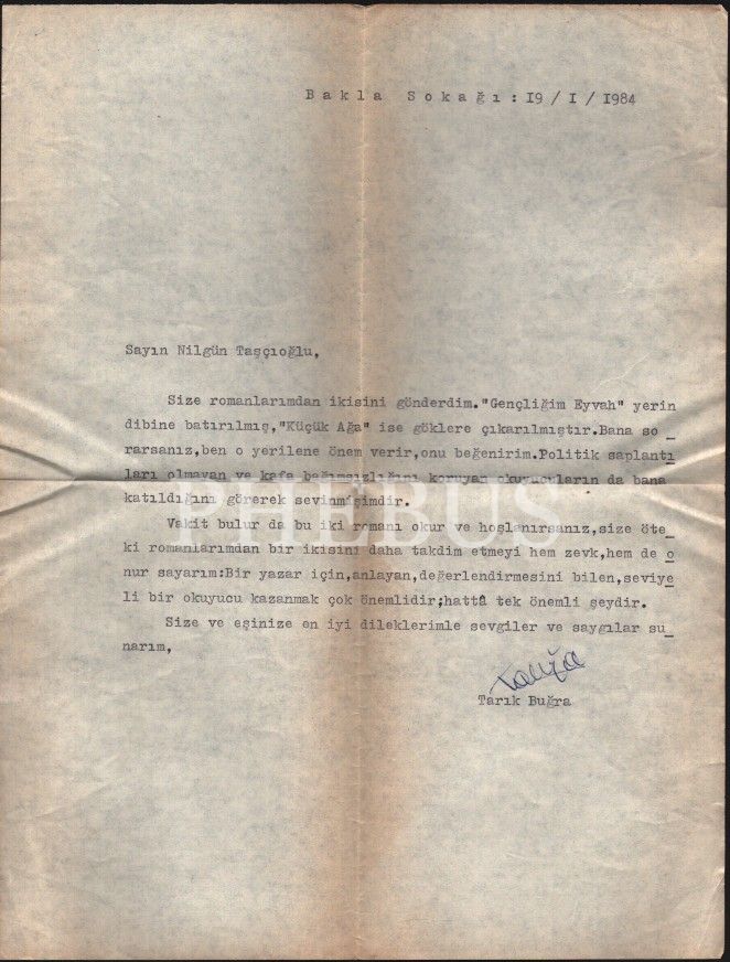 İthaf, "Sayın Nilgün Taşçıoğlu için sağlık ve mutluluk dileyerek, 18.1.1984 Tarık Buğra"; mektup, "Bakla Sokağı: 19/1/1984 Sayın Nilgün Taşçıoğlu, Size romanlarımdan ikisini gönderdim. "Gençliğim Eyvah" yerin dibine batırılmış, "Küçük Ağa" ise göklere çıkarılmıştır. Bana sorarsanız, ben o yerilene önem verir, onu beğenirim. Politik saplantıları olmayan ve kafa bağımsızlığını koruyan okuyucuların da bana katıldığını görerek sevinmişimdir. Vakit bulur da bu iki romanı okur ve hoşlanırsanız, size öteki romanlarımdan bir ikisini daha takdim etmeyi hem zevk, hem de onur sayarım: Bir yazar için, anlayan, değerlendirmesini bilen, seviyeli bir okuyucu kazanmak çok önemlidir; hatta tek önemli şeydir. Size ve eşinize en iyi dileklerimle sevgiler ve saygılar sunarım, Tarık Buğra" şeklindedir.