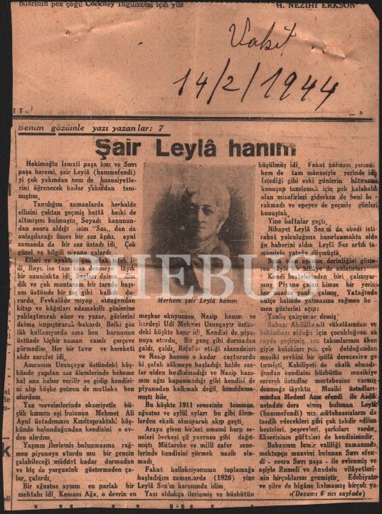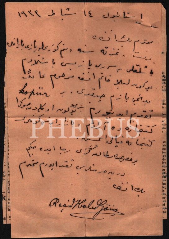 "Muhterem Beyefendi, Vakit gazetesine 'Benim Gözümle Yazı Yazanlar' başlıklı bir seri yazısı başladım. Bugün, Leylâ Hanımefendi merhuma ait yedinci yazım çıktı. Bir kupür takdim ediyorum. Sizi bugün öğleden sonra kütüphanede aradım. Pazartesi günleri kütüphane kapalı imiş. Bu hususta mütalaanızı rica edeceğim. Derin hürmetlerimi takdim ederim muhterem beyefendi. Reşid Halid Gönç. 14 Şubat 1933 - İstanbul."