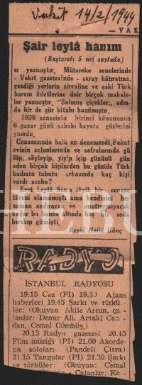 "Bâb-ı Âli´nin kütüğünü yazan" Reşid Halid Gönç´ten ıslak imzalı, Leylâ Saz konulu mektup ve Gönç´ün 14 Şubat 1944 tarihinde Vakit gazetesinde yayınlanan Leylâ Saz konulu yazısının küpürleri, 16x25 cm