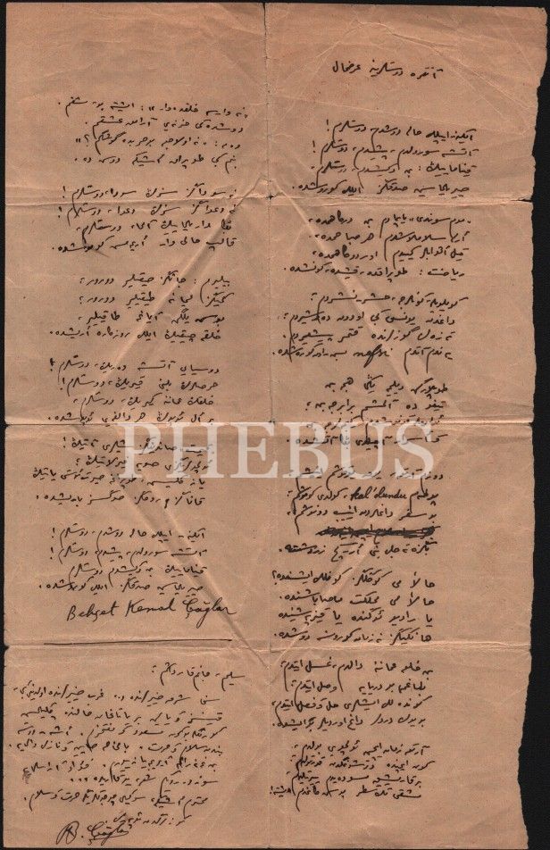 Behçet Kemal Çağlar´ın, el yazısıyla kaleme aldığı, ıslak imzalı "Ankara Dostlarına Arzuhal" şiiri ve aynı kâğıtta bulunan şahsî mektup, 20x32 cm