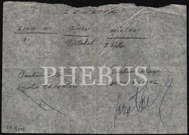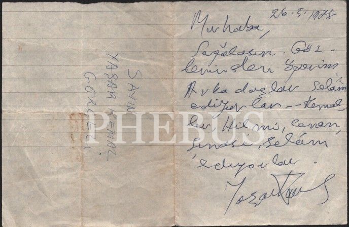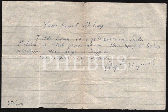 1) "Yaşar Kemal Arkadaş, Tilda hanım yarın gelecekmiş. İyiler. Portakal ve jilet gönderiyorum. Ben iyiyim. Bütün arkadaşlara selam, sevgi ve saygılar. Bir isteğiniz varsa bildirin. Ayata Beğensel 2) "26.5.1978 Merhaba, Sağolasın. Gözlerimden öperim. Arkadaşlar selâm ediyorlar - Kemal, [?], Hilmi, Canan, Şinasi, selâm ediyorlar. Yaşar Kemal"