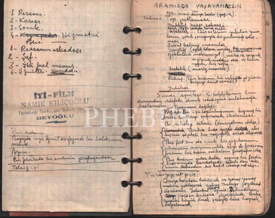 Defterin ilk sayfalarında, "Türkiye´ye ait bazı gizli belgeleri ele geçirmek isteyen vatan hainlerini teker teker yakalayan gizli polis Ali´nin öyküsü"nün anlatıldığı, Bülent Oran´ın da oyuncularından biri olduğu "ARAMIZDA YAŞAYAMAZSIN" [1954] filminin senaryosu ile içlerinde Metin Eloğlu’nun da bulunduğu arkadaşlarının ve sinema şirketlerinin irtibat bilgilerini içeren bir fihrist yer almaktadır.