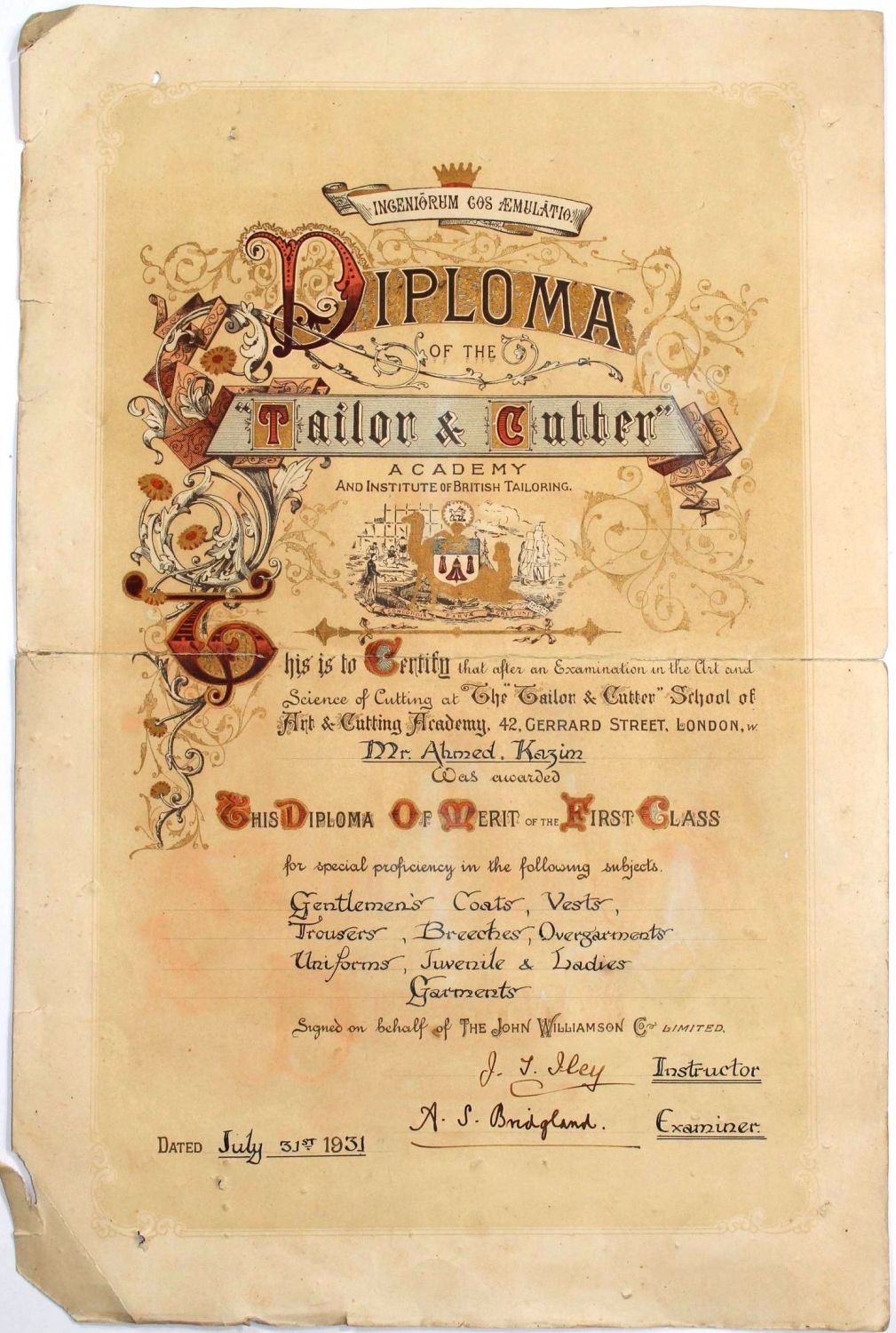 1931 tarihli Londra'da Tailor Cubber Akademi tarafından Ahmed Kazım Bey'e verilmiş terzi diploması, 34x50 cm