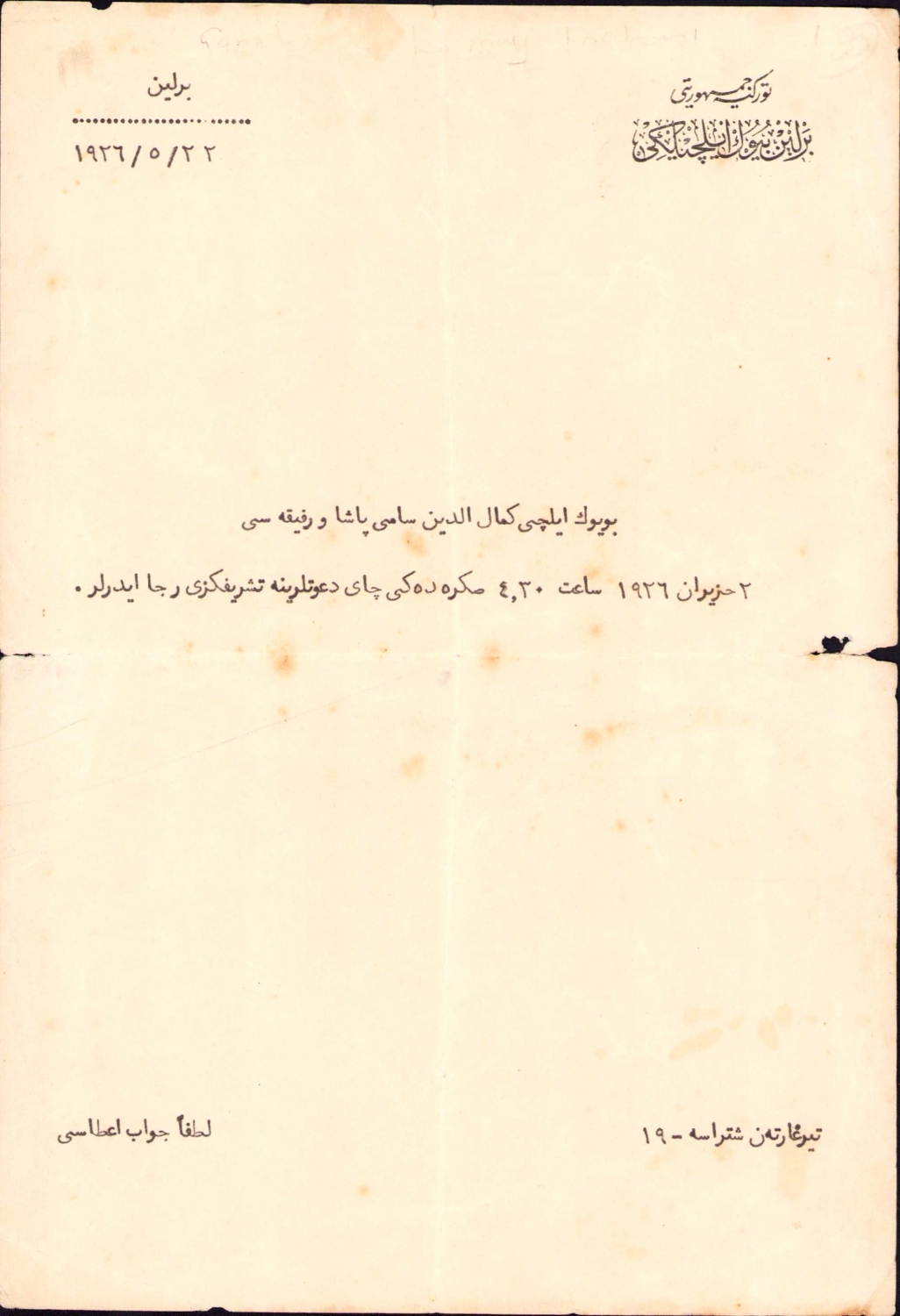 Osmanlıca Türkiye Cumhuriyeti Berlin Büyükelçiliği antetli çay daveti, Berlin, 1926, 16x24 cm