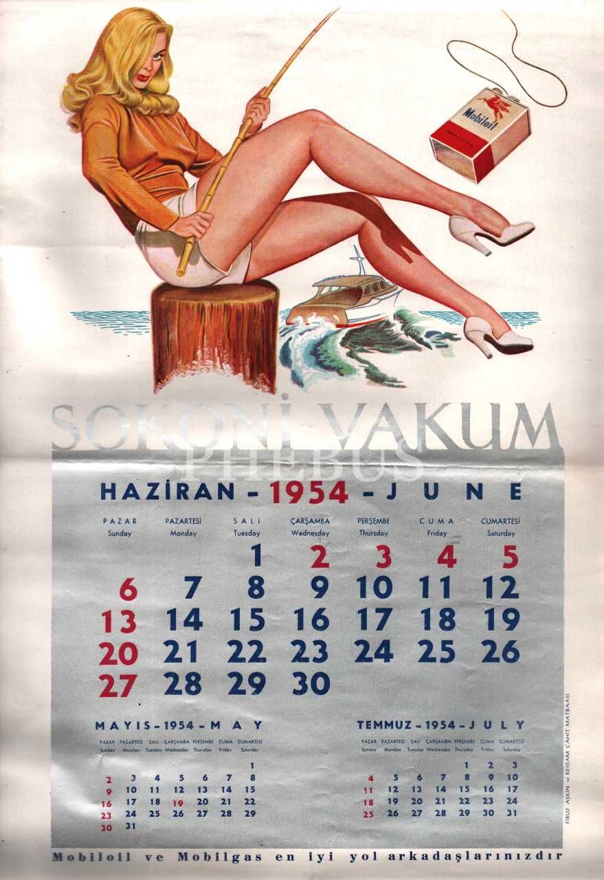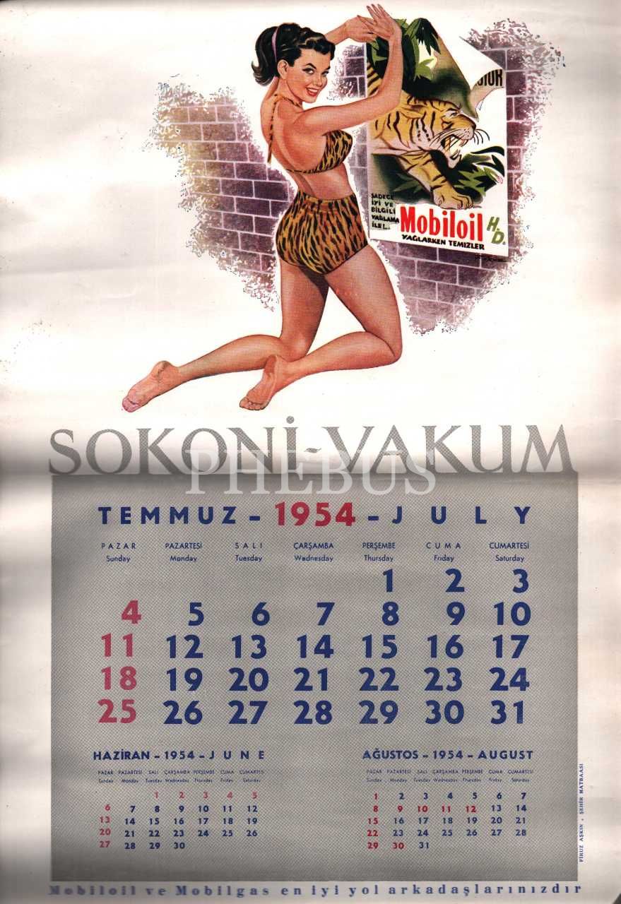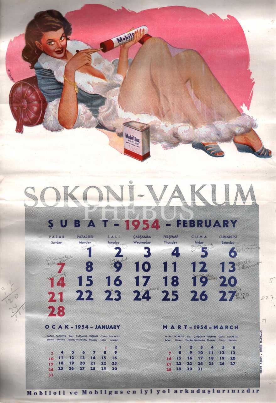 Şubat-Temmuz 1954 aylarına ait, Mobilgas reklamlı Sokoni-Vacum takvim sayfaları, 30x45 cm