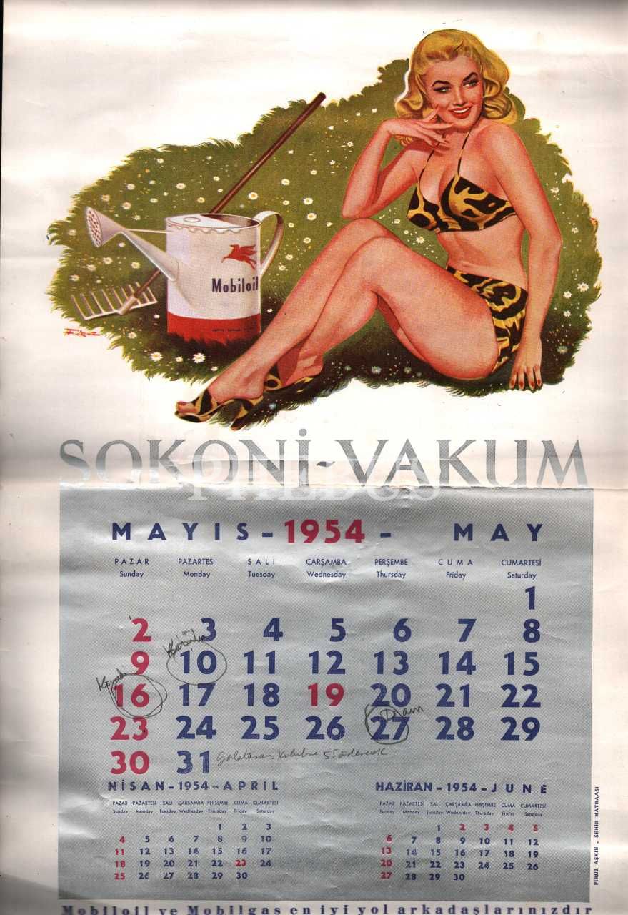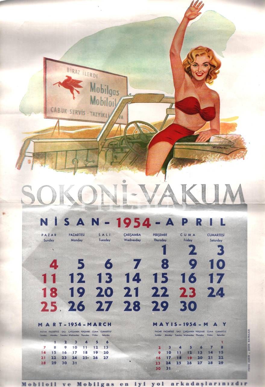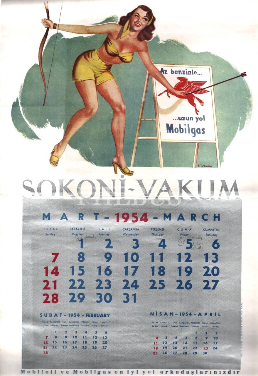 Şubat-Temmuz 1954 aylarına ait, Mobilgas reklamlı Sokoni-Vacum takvim sayfaları, 30x45 cm