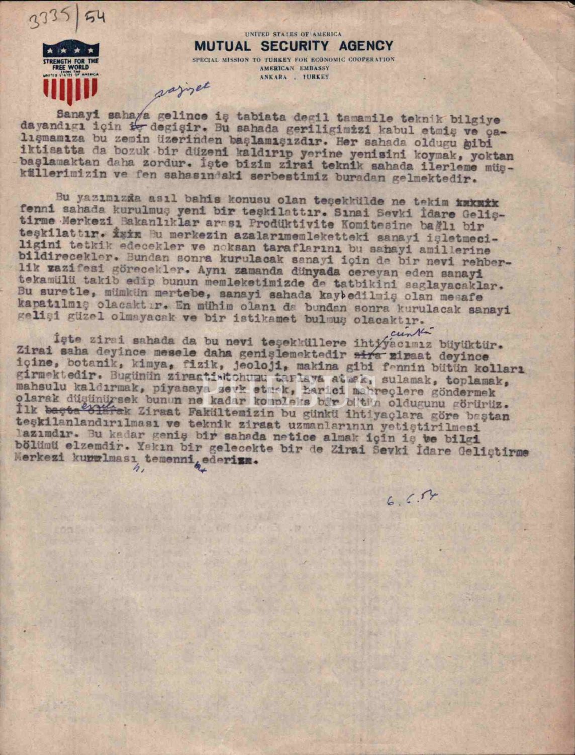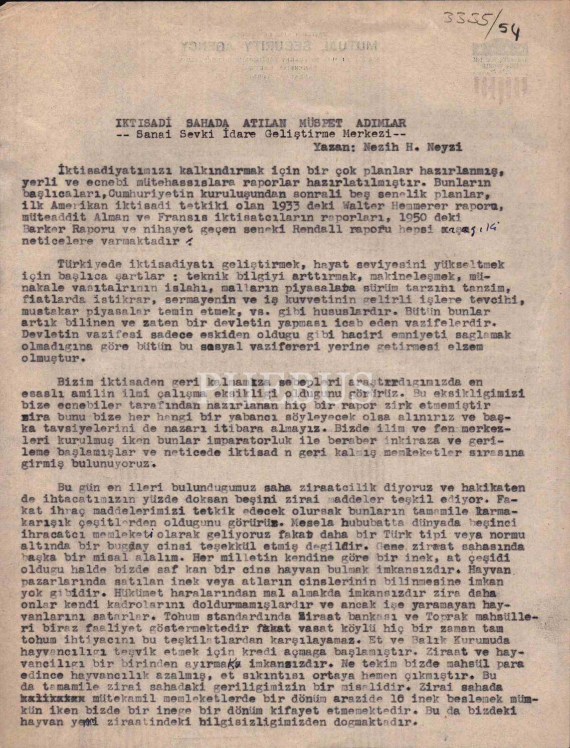 Mutual Security Agency antetli kâğıda, Nezih Neyzi tarafından yazılmış "İktisadi Sahada Atılan Müspet Adımlar" başlıklı yazı, 20x25 cm