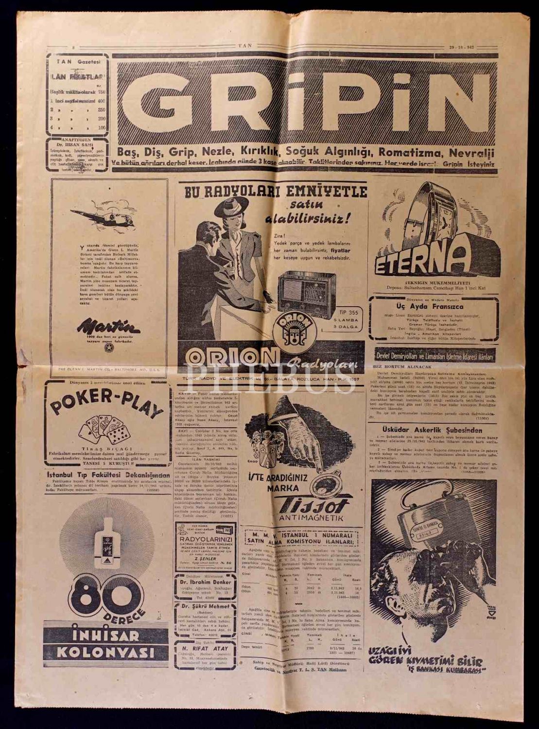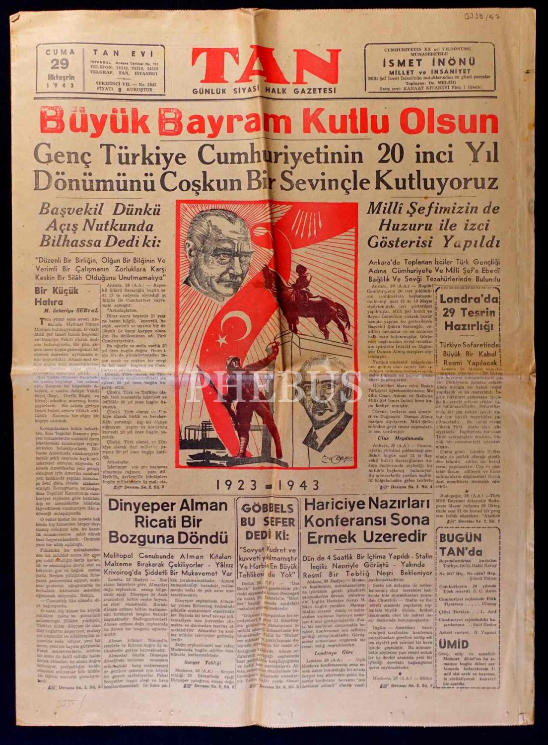 Atatürk ve İsmet İnönü görselli, "Büyük Bayram Kutlu Olsun" manşetli TAN gazetesi, 29 İlkteşrin 1943, 43x58 cm