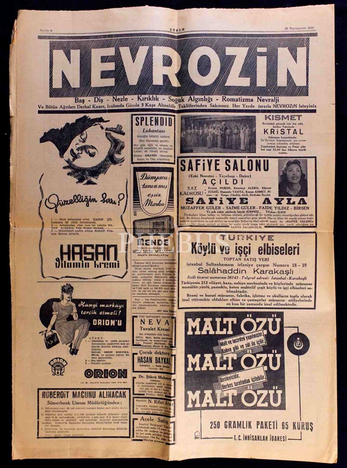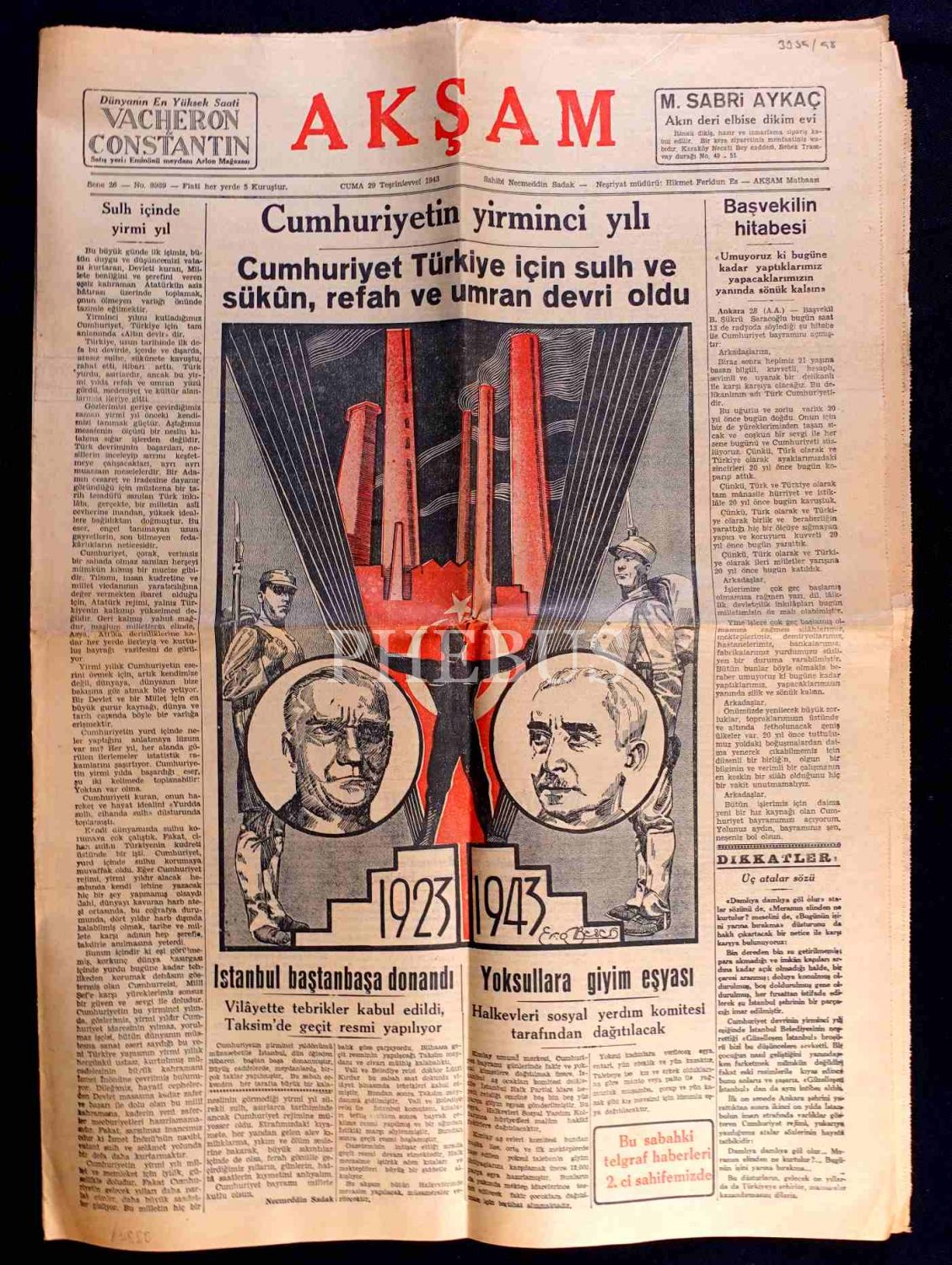 Atatürk ve İsmet İnönü görselli, "Cumhuriyetin Yirminci Yılı" manşetli AKŞAM gazetesi, 29 Teşrinievvel 1943, 40x55 cm