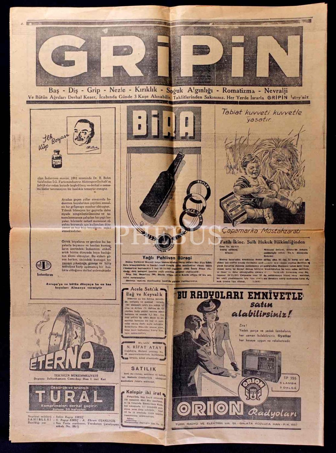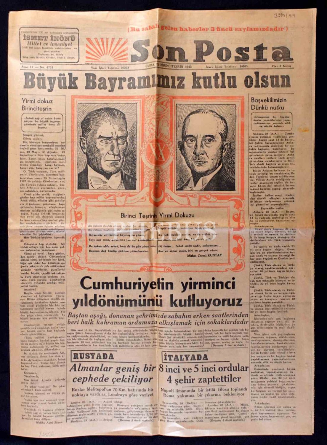 "Büyük Bayramımız Kutlu Olsun" manşetli, Atatürk ve İsmet İnönü görselli SON POSTA gazetesi, 29 Birinciteşrin 1943, 38x54 cm