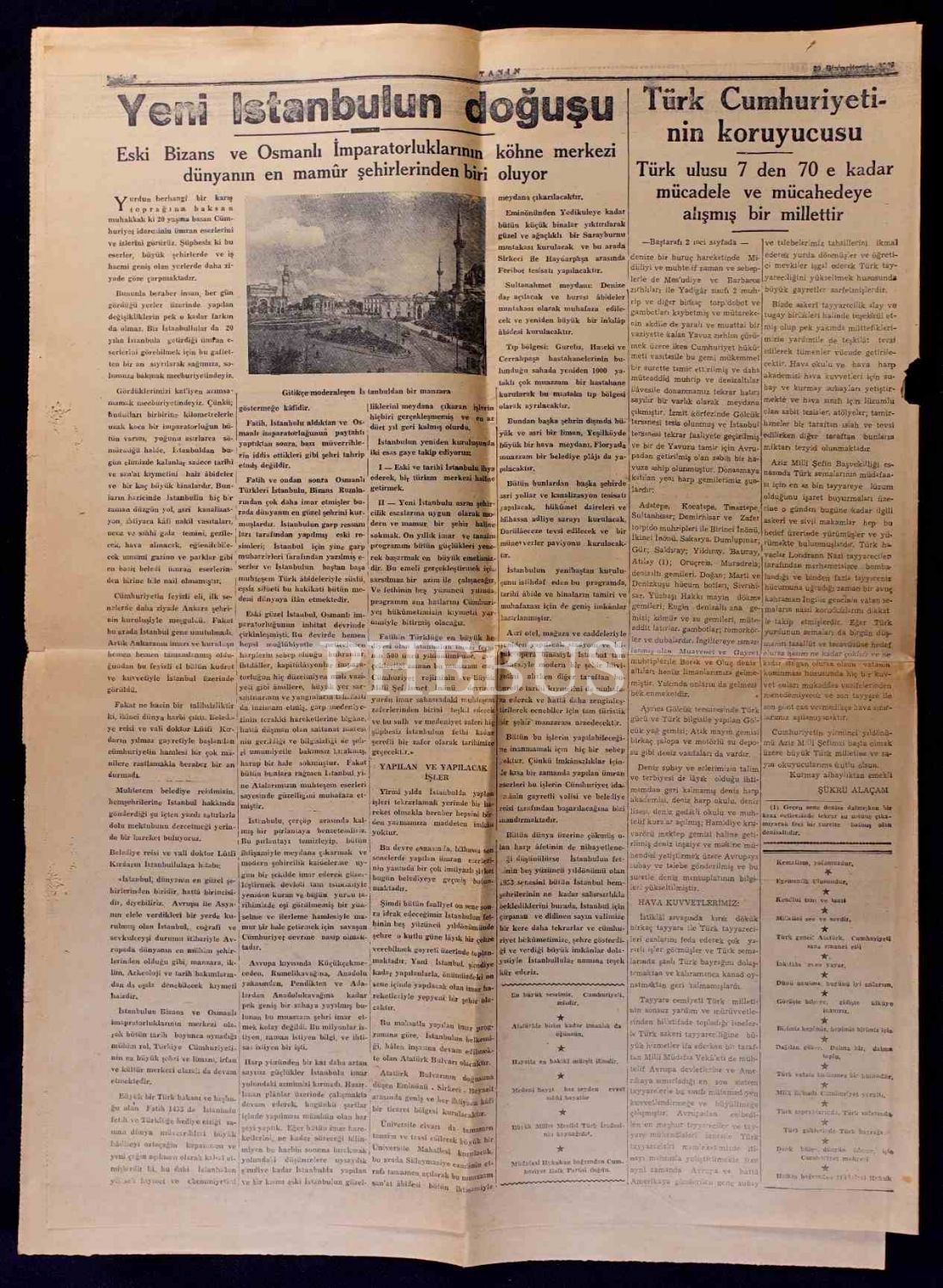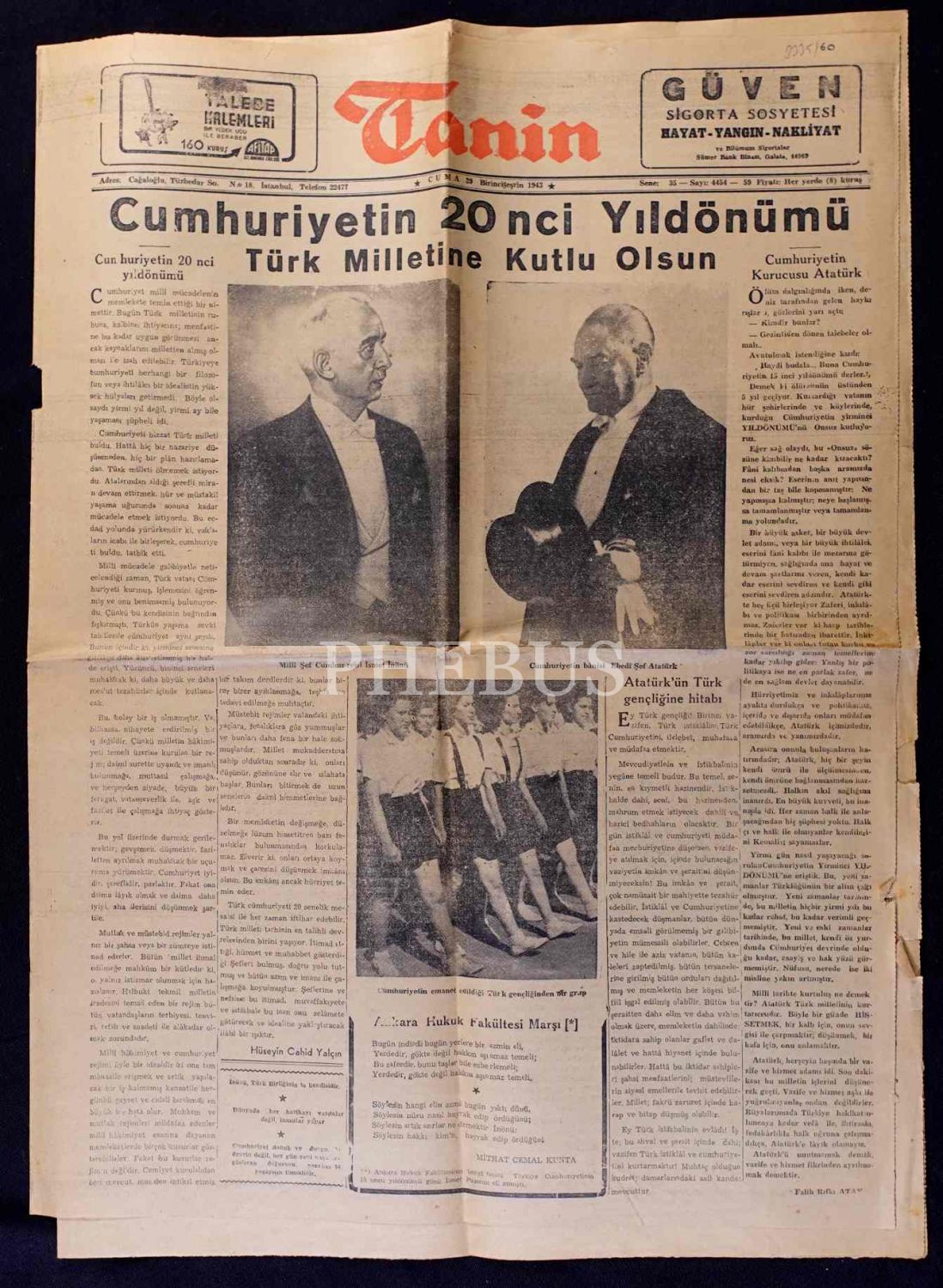 "Cumhuriyetin 20 nci Yıldönümü Türk Milletine Kutlu Olsun" manşetli, Atatürk ve İsmet İnönü görselli TANİN gazetesi, 29 Birinciteşrin 1943, 38x54 cm