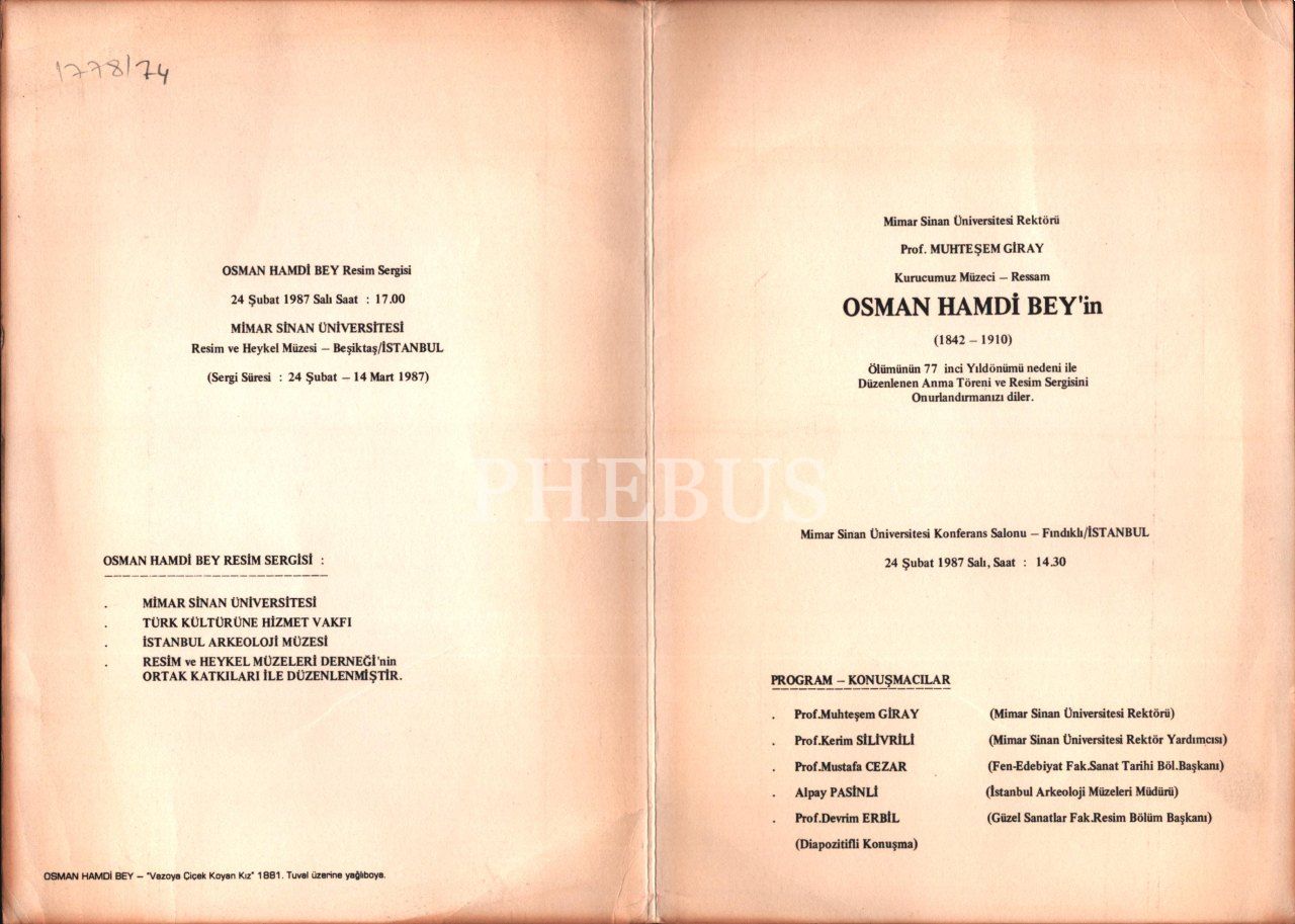 Osman Hamdi Bey´in vefatının 77. yıldönümü için düzenlenen anma töreni ve resim sergisi davetiyesi, İstanbul 1987, 17x24 cm
