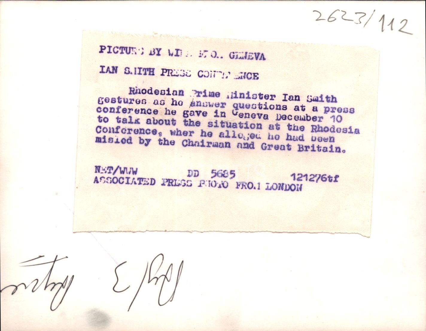 "Ian Smith, Rodezya konferansındaki durum hakkında konuşmak için 10 Aralık´ta Cenevre´de verdiği bir basın toplantısında soruları yanıtlarken."